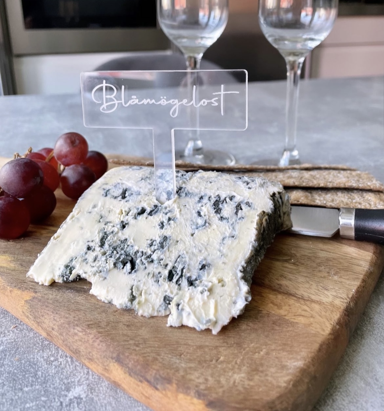 Skapas med gravyr på genomskinlig plexi eller ljust naturellt trä.