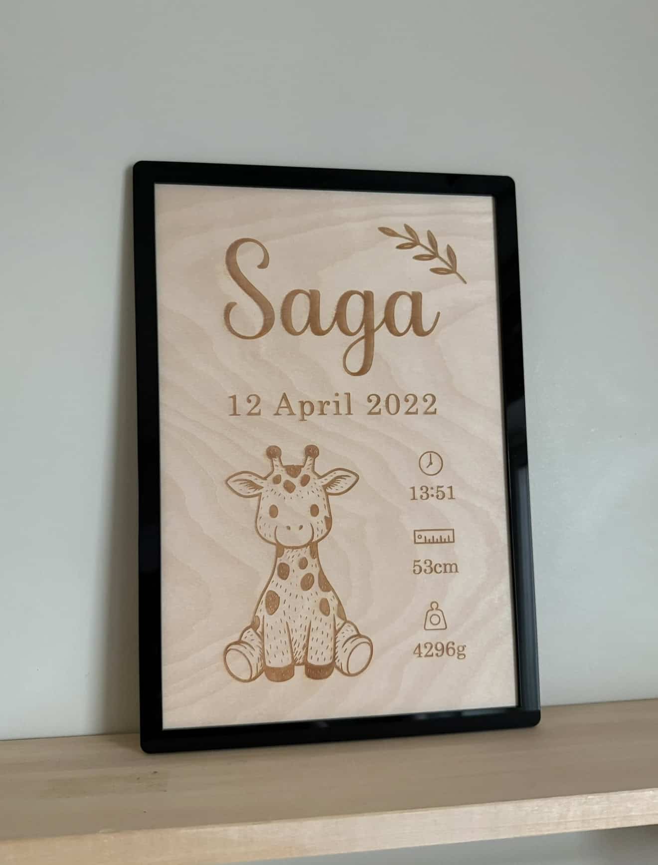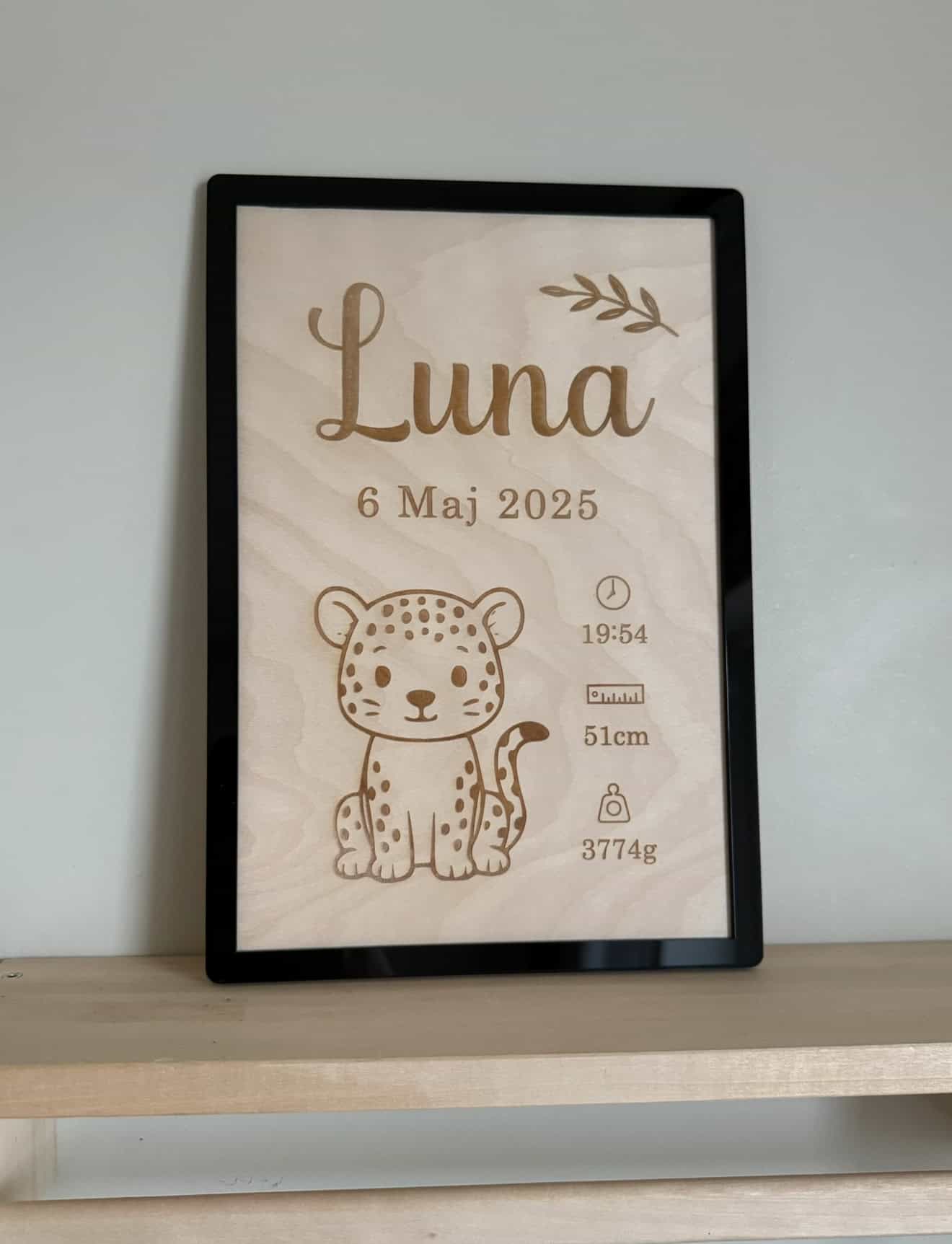 En vacker tidlös inredningsdetalj med barnets födelseuppgifter – namn, datum, klockslag, längd och vikt tillsammans med ett gulligt djurmotiv som du själv väljer.