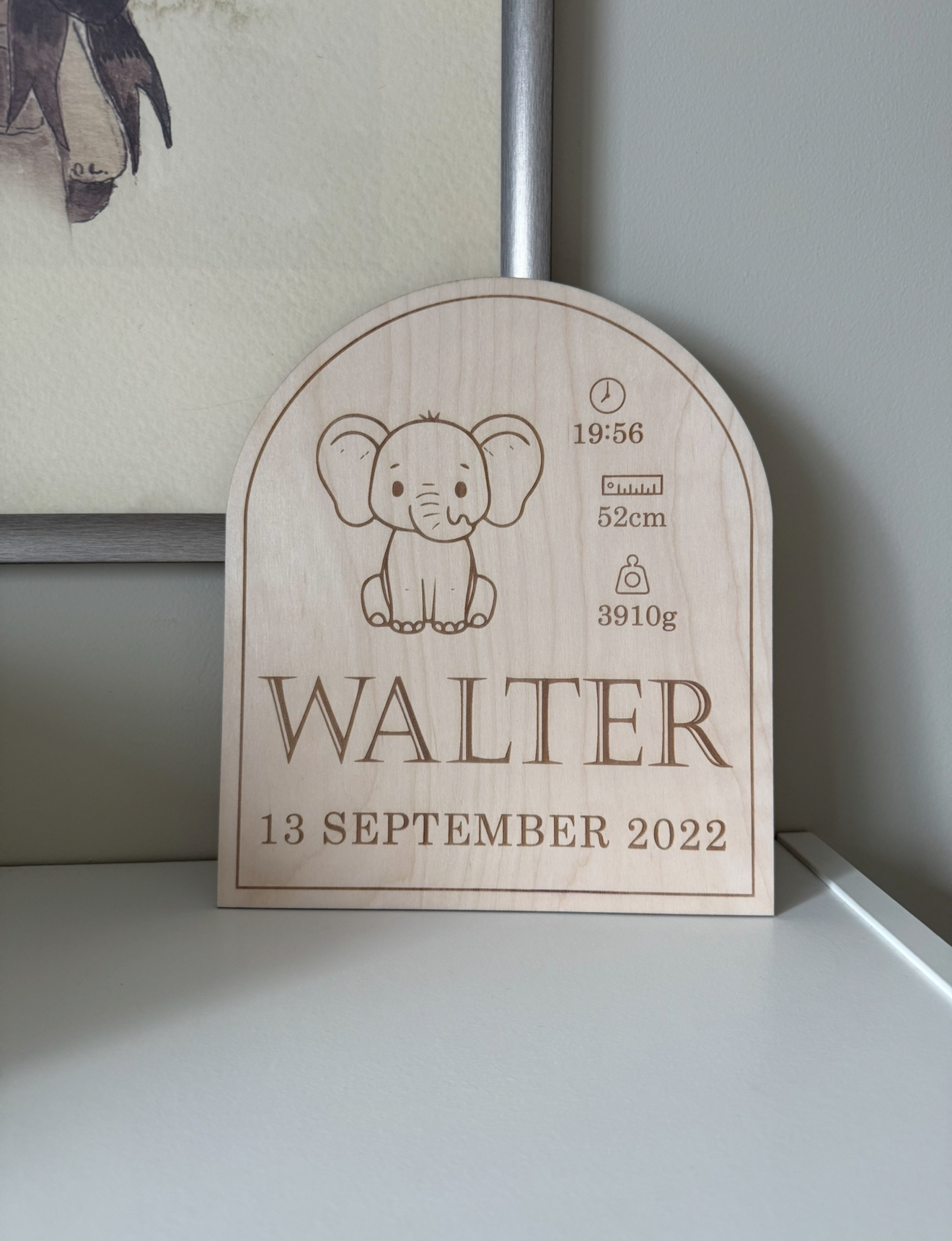 En vacker tidlös inredningsdetalj med barnets födelseuppgifter – namn, datum, klockslag, längd och vikt tillsammans med valfritt djur som du själv väljer