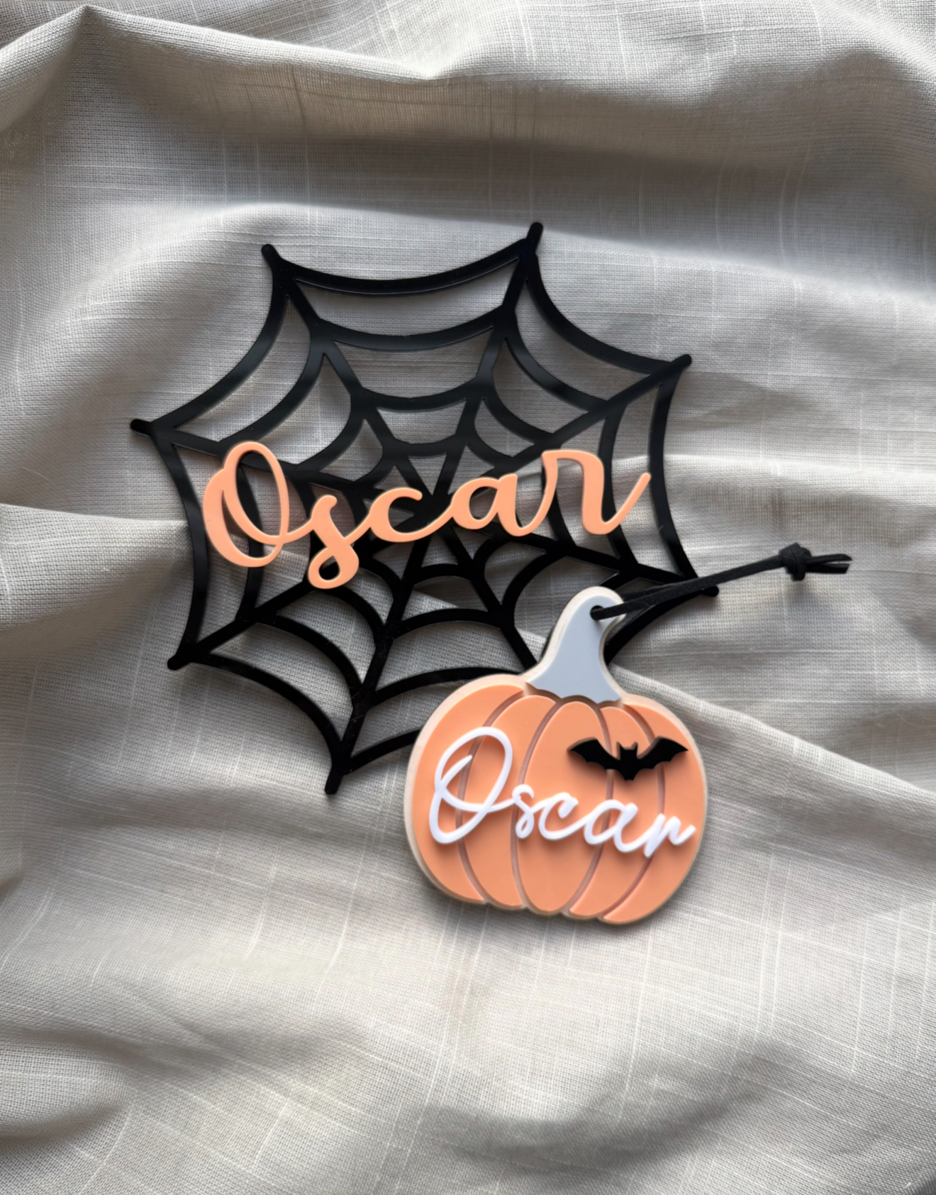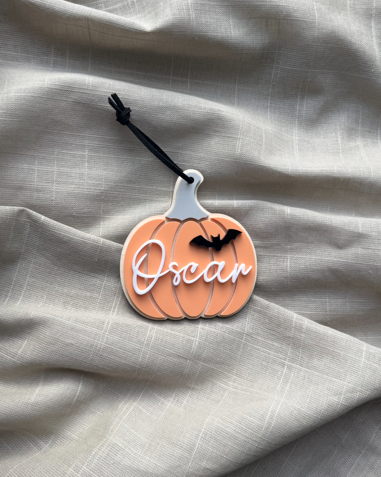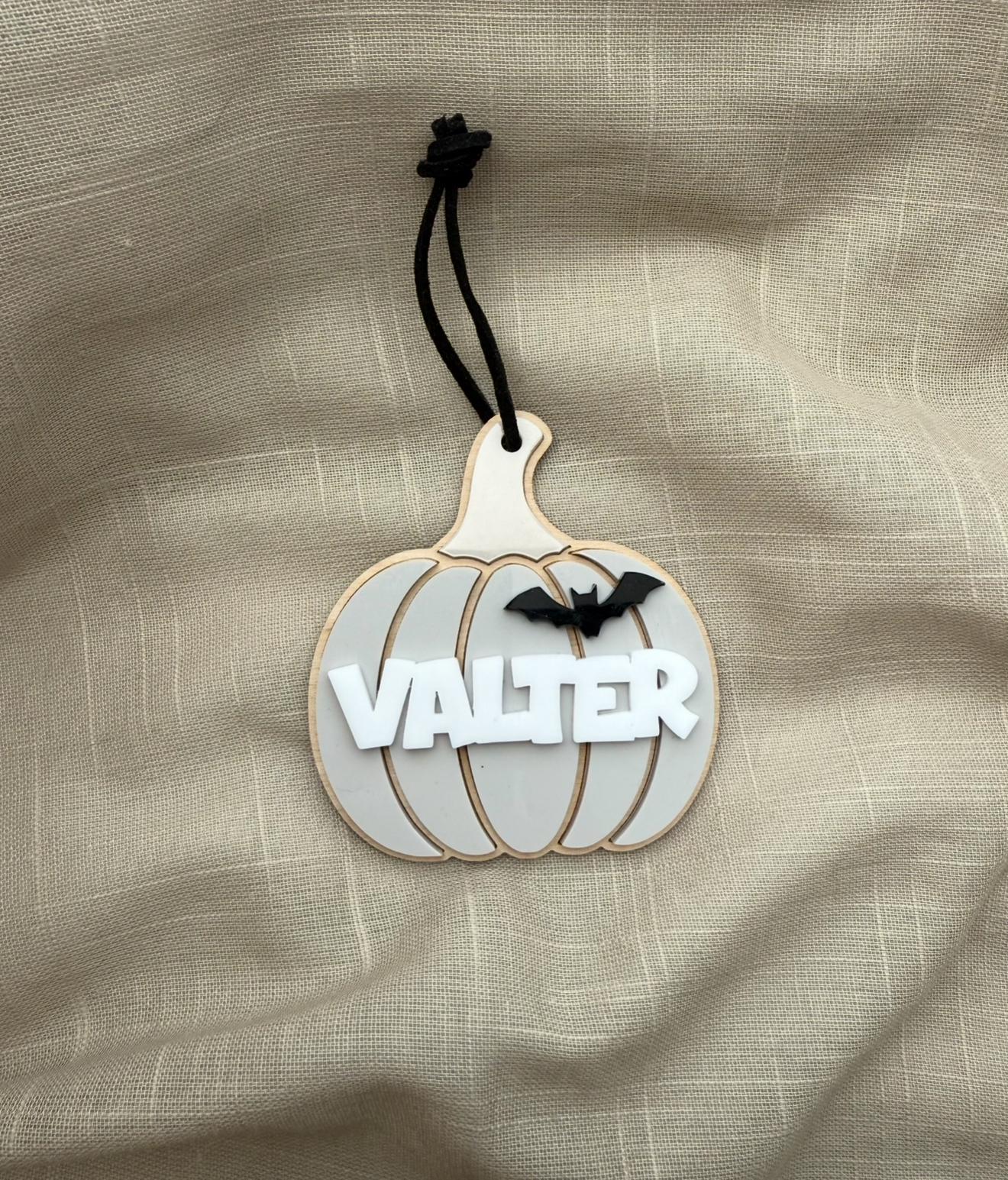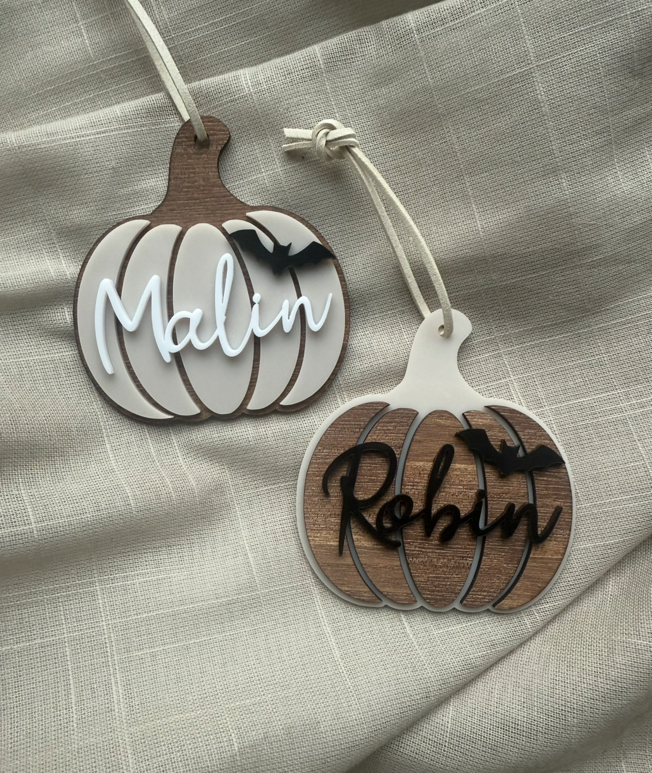 Skapas med botten i naturell trä och pumpa och namn i akryl