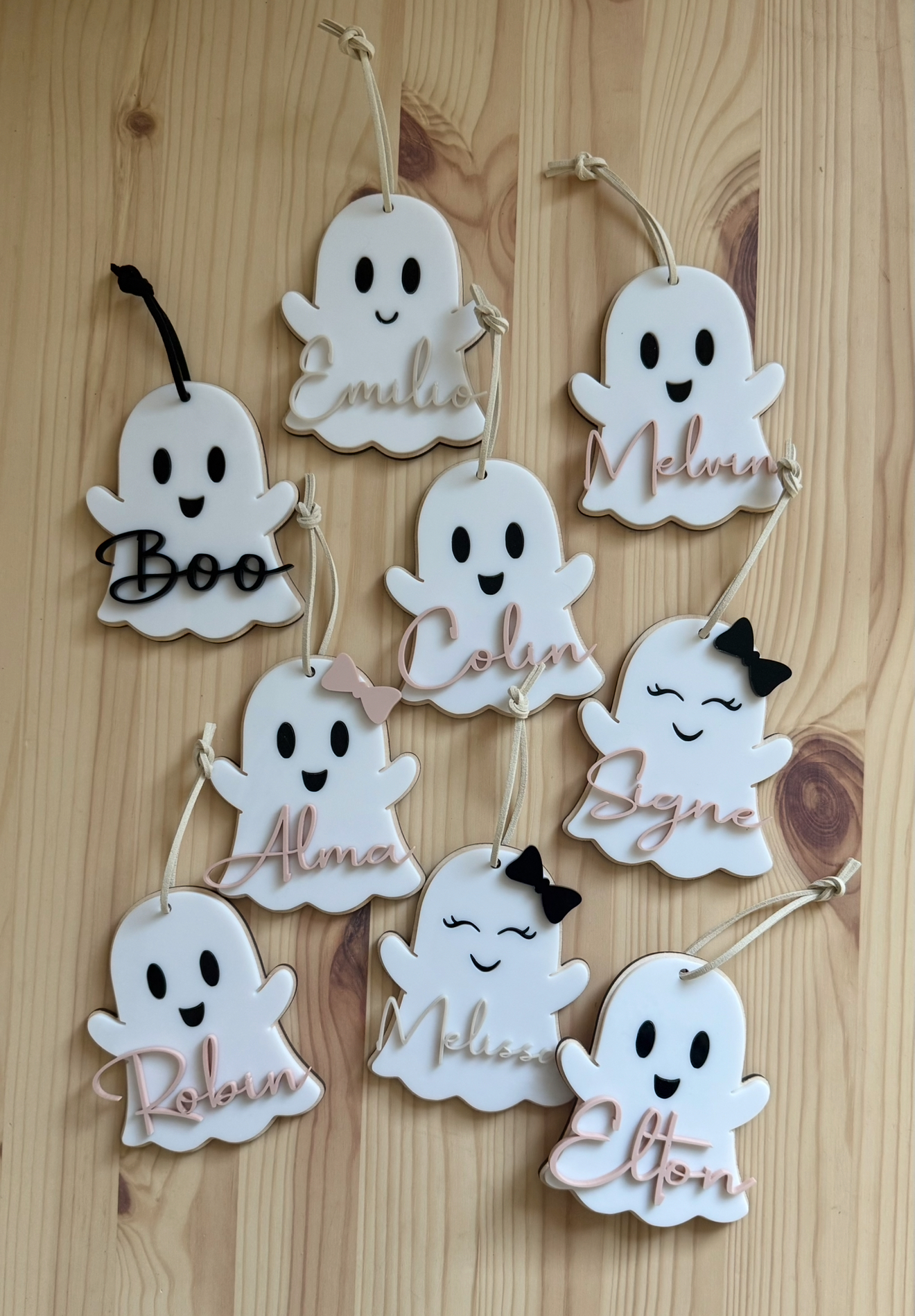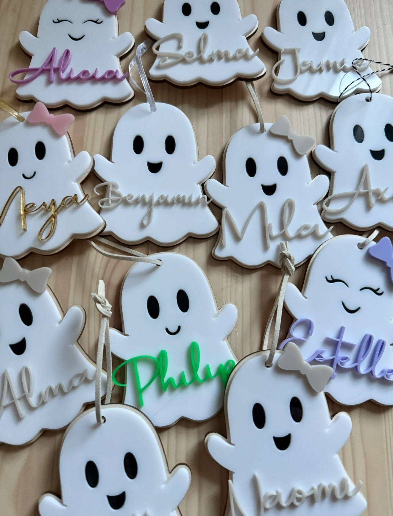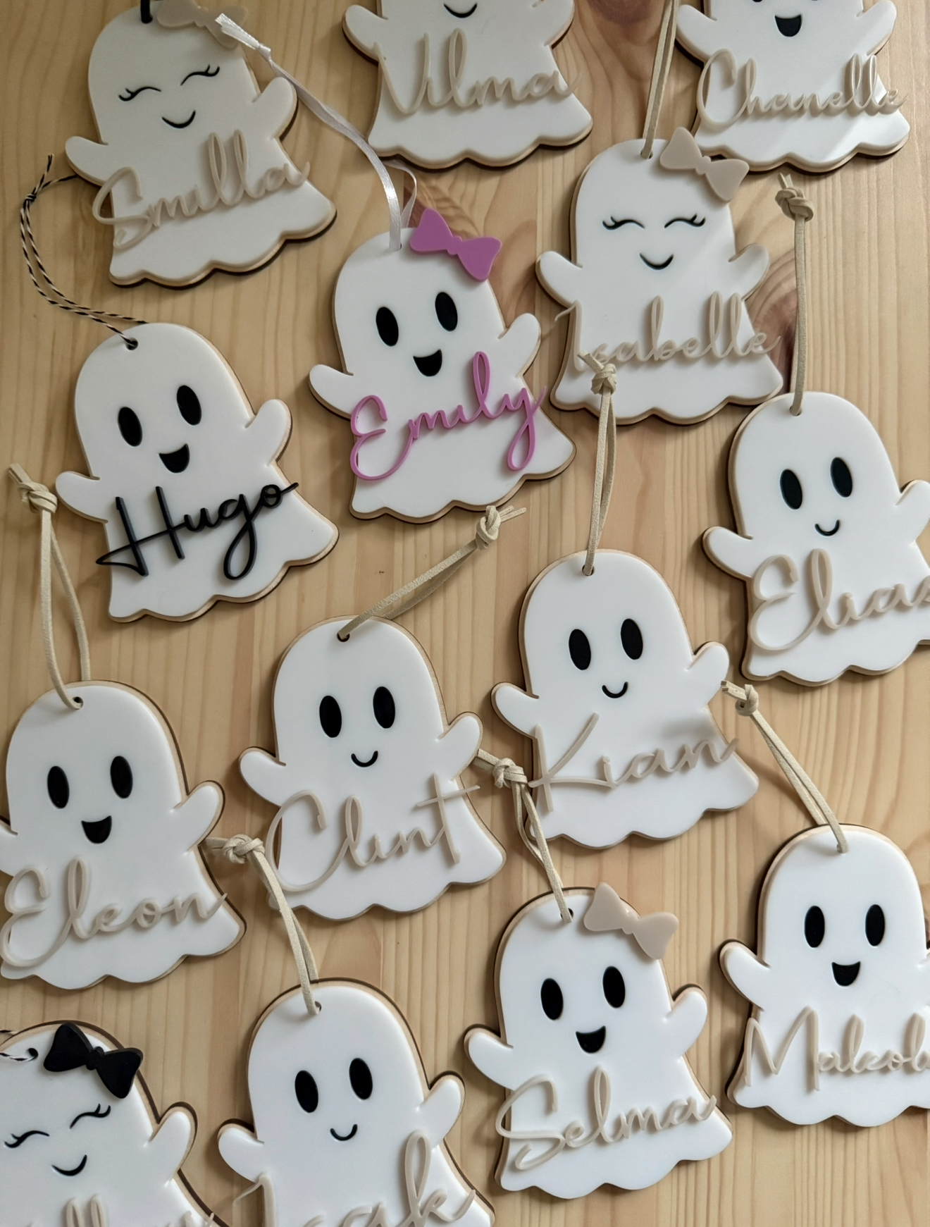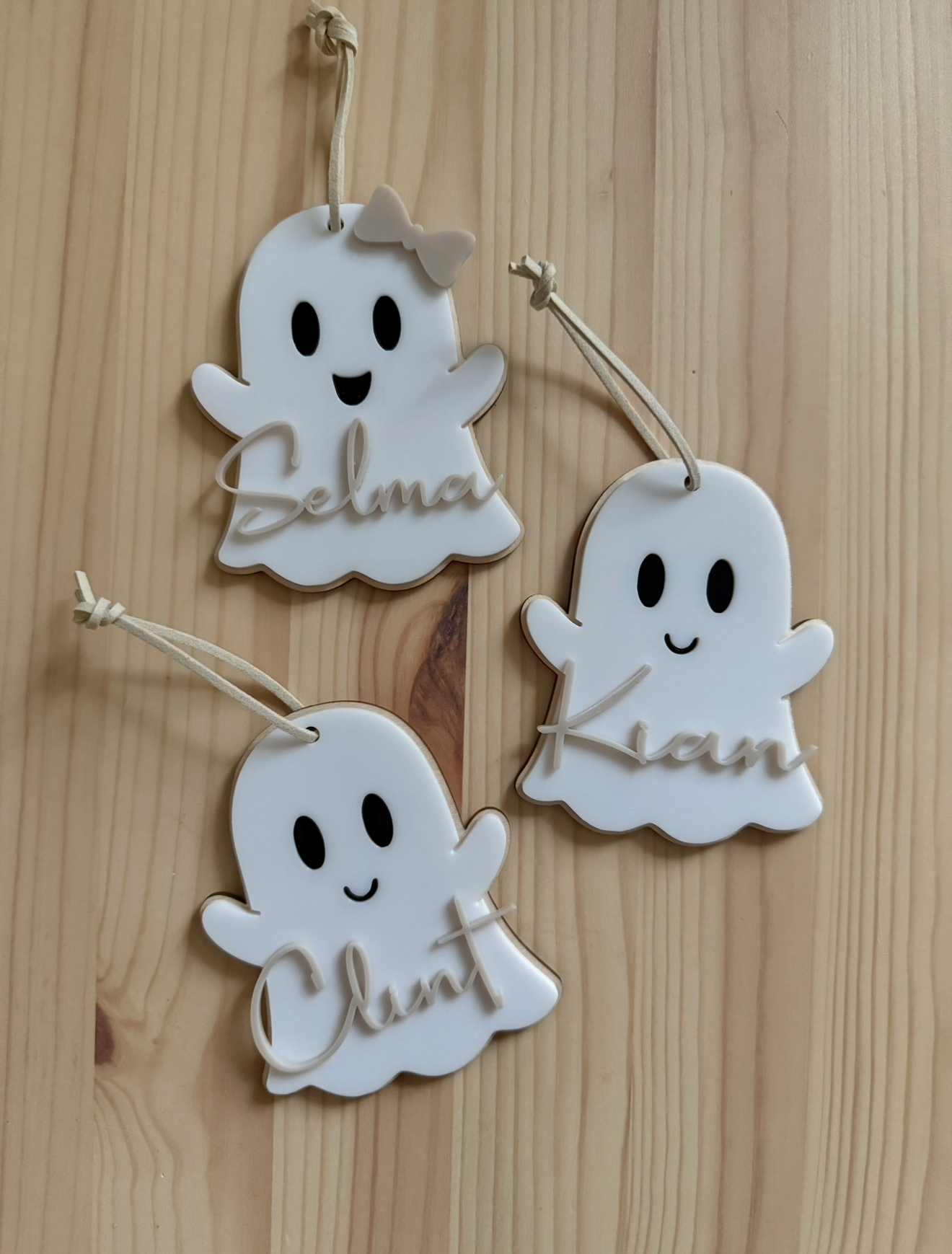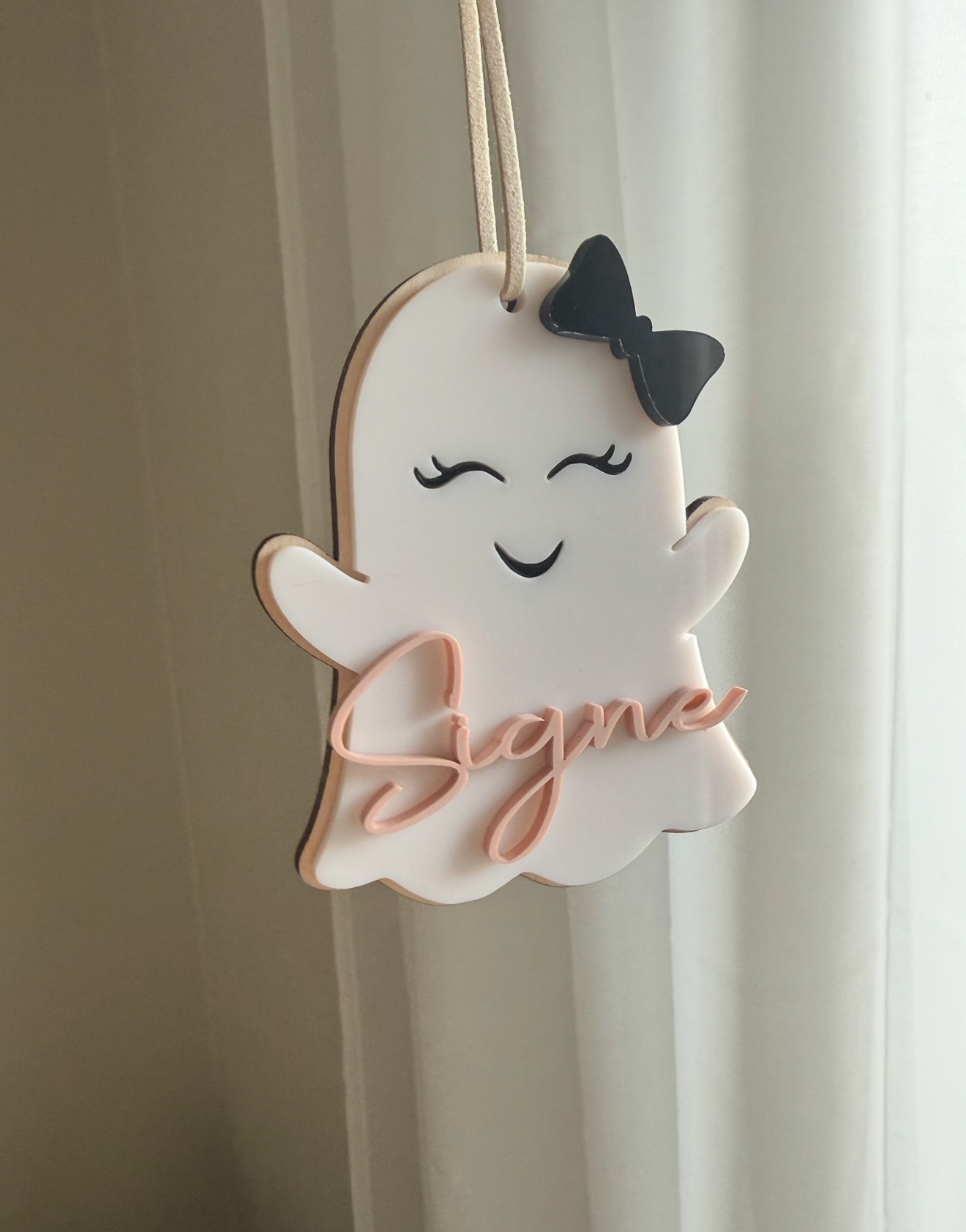 Skapas med botten i naturell trä, spöke i vit akryl och namn i akryl/trä
