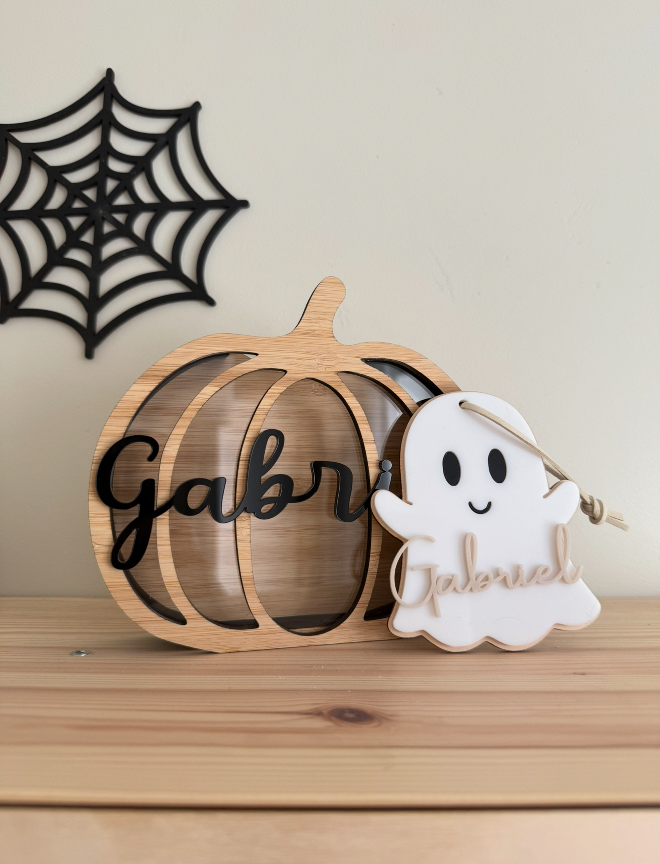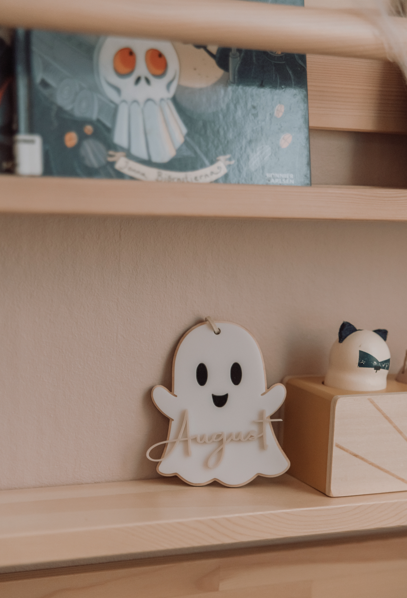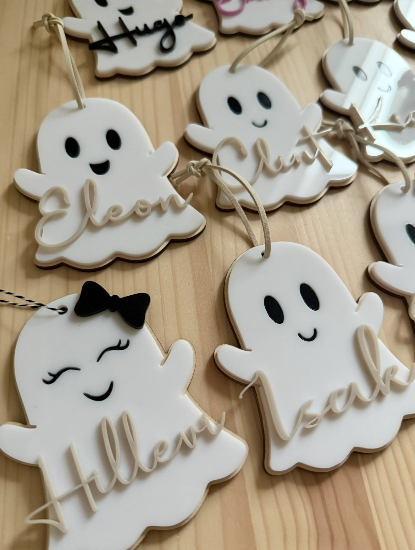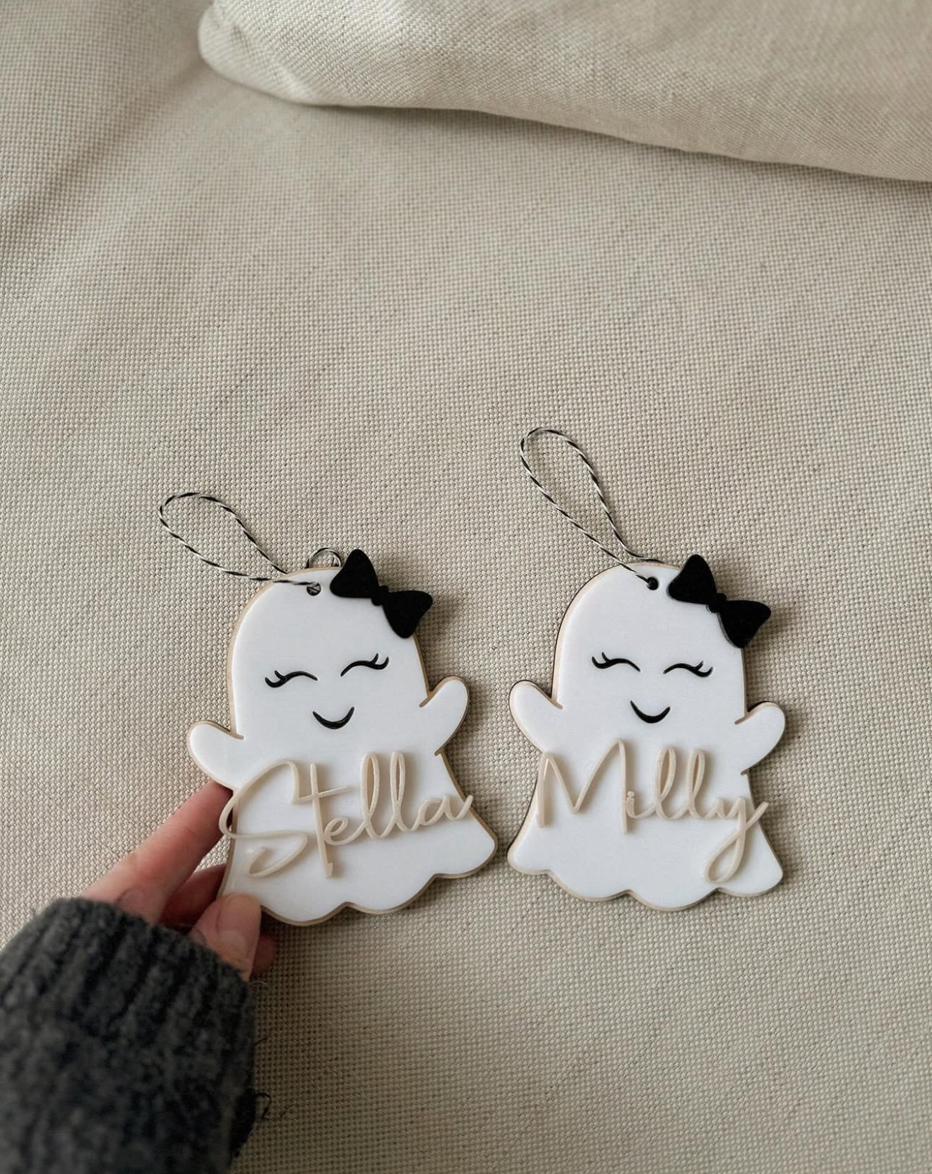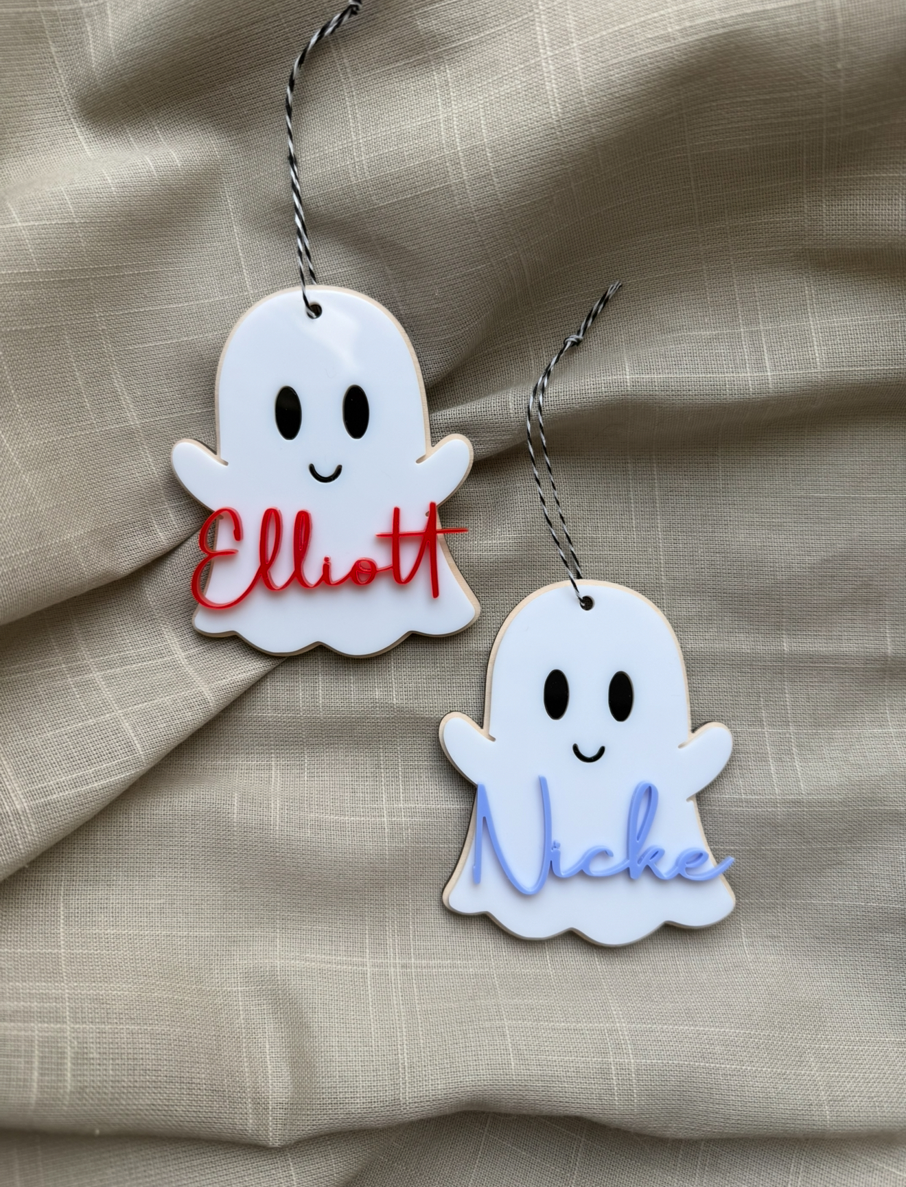 Skapas med botten i naturell trä, spöke i vit akryl och namn i akryl/trä