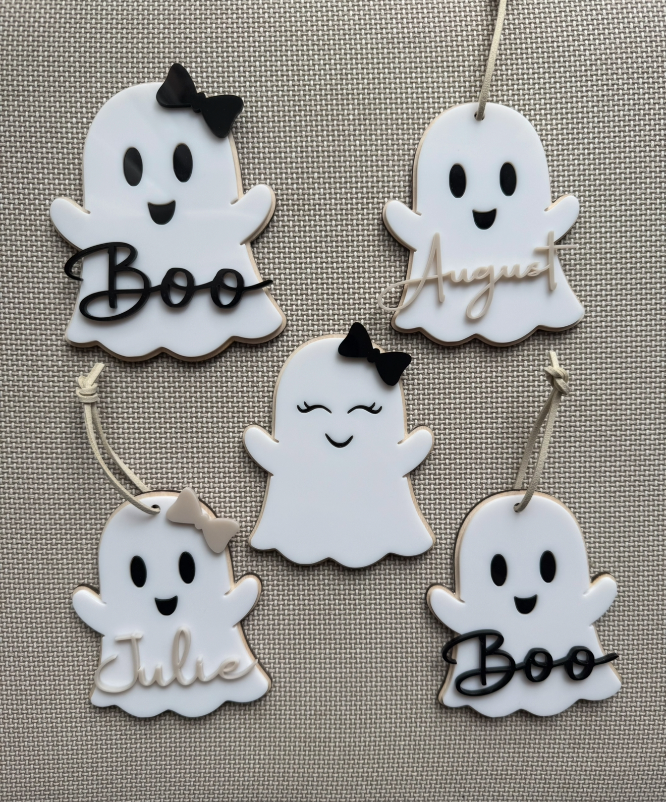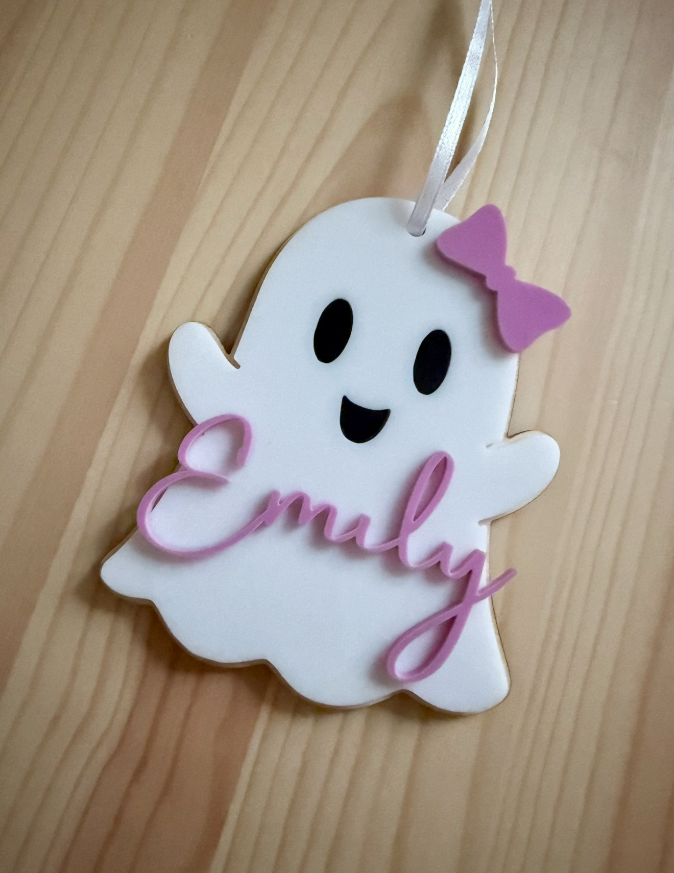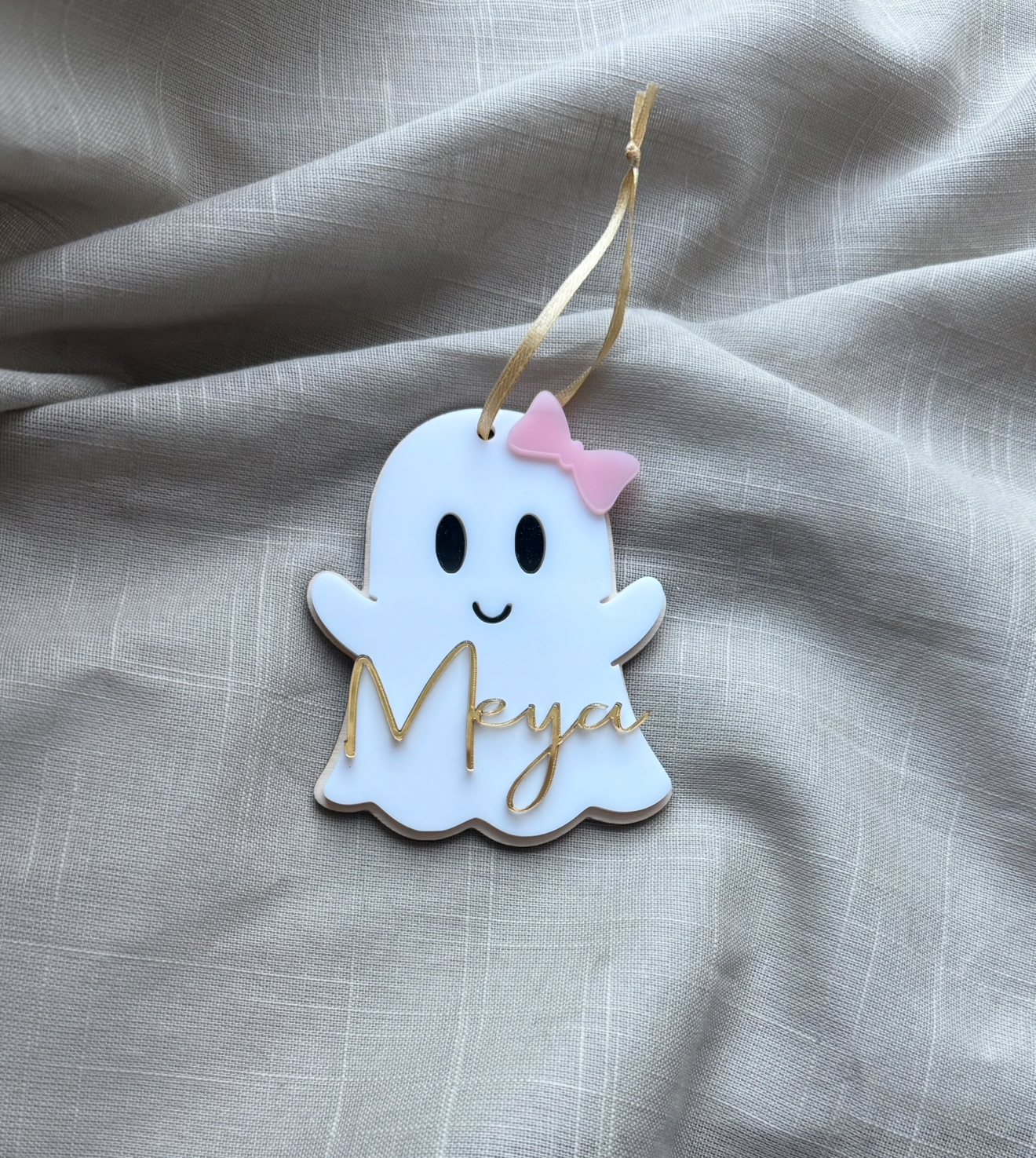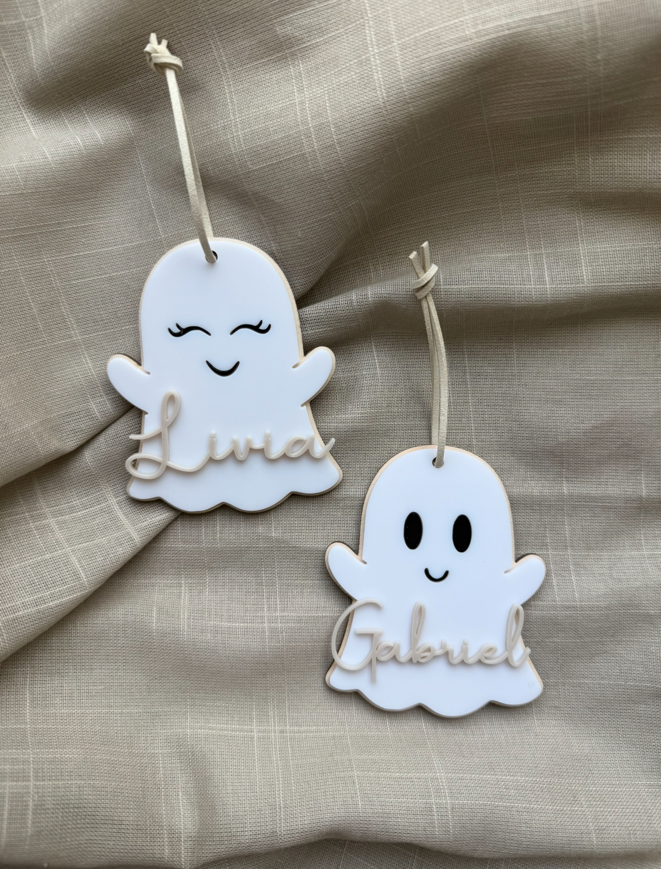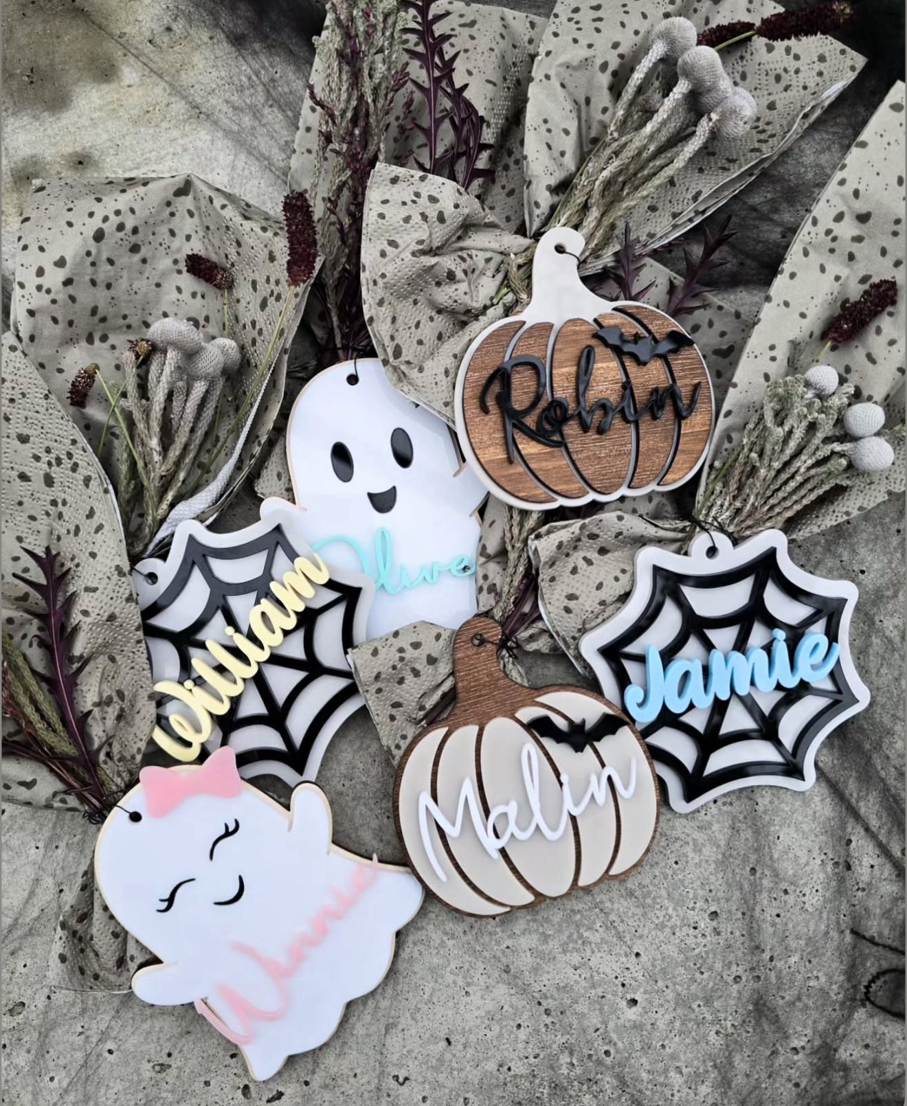 Skapas med botten i naturell trä, spöke i vit akryl och namn i akryl/trä