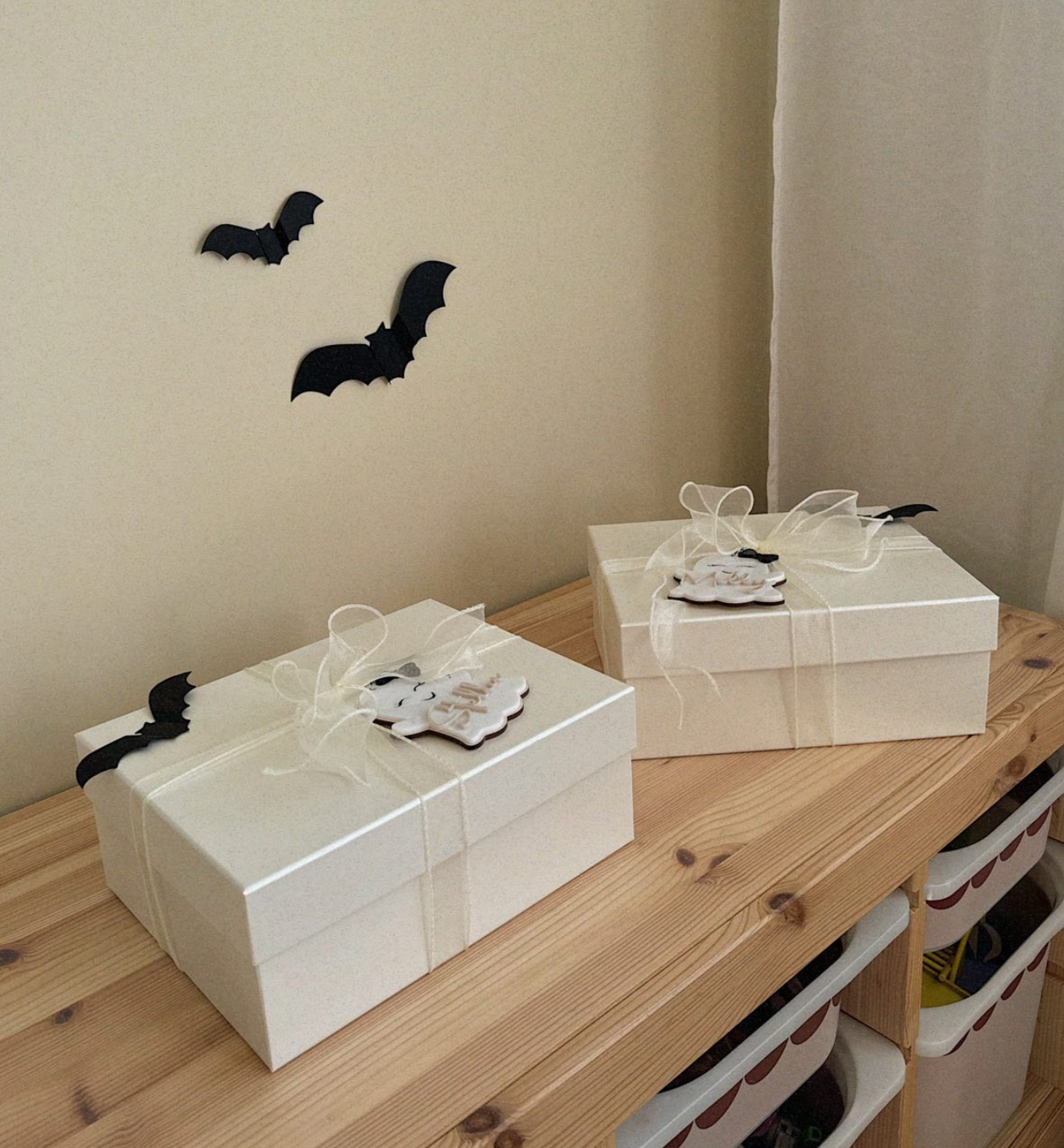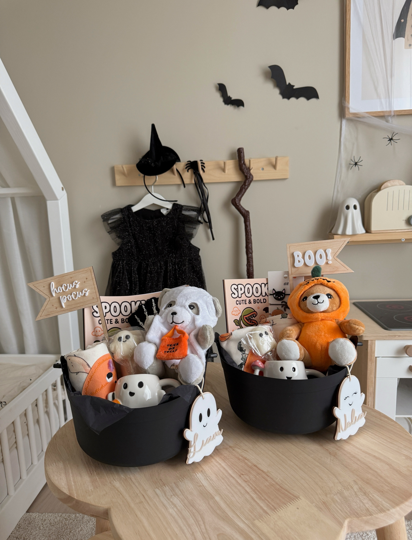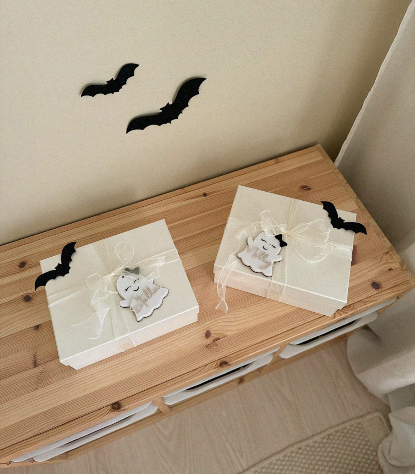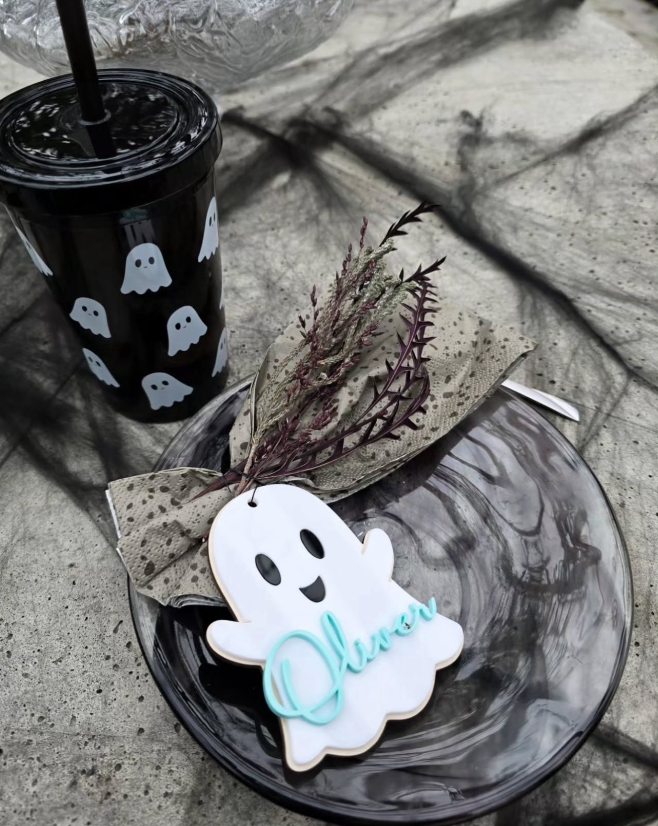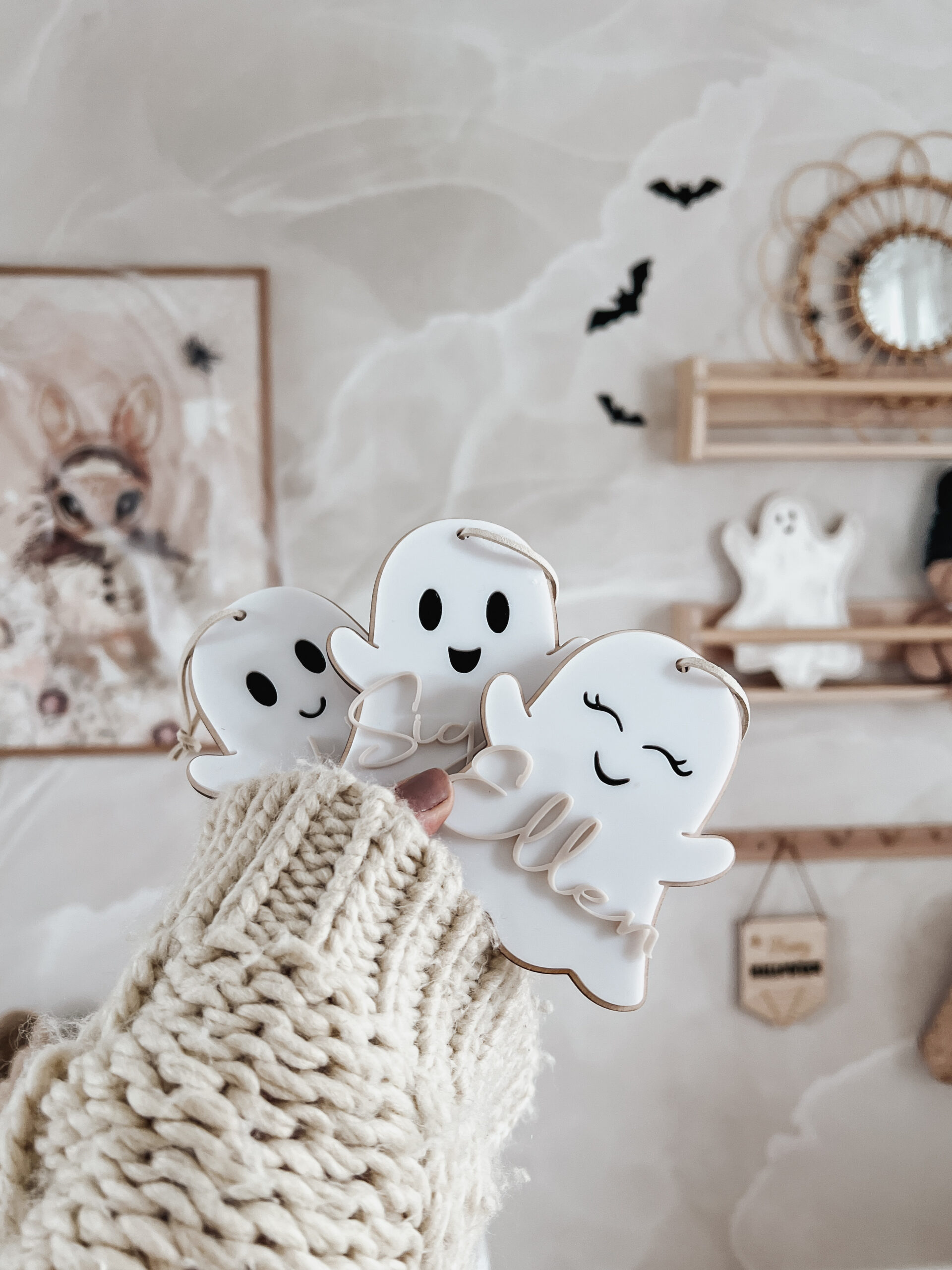 Skapas med botten i naturell trä, spöke i vit akryl och namn i akryl/trä