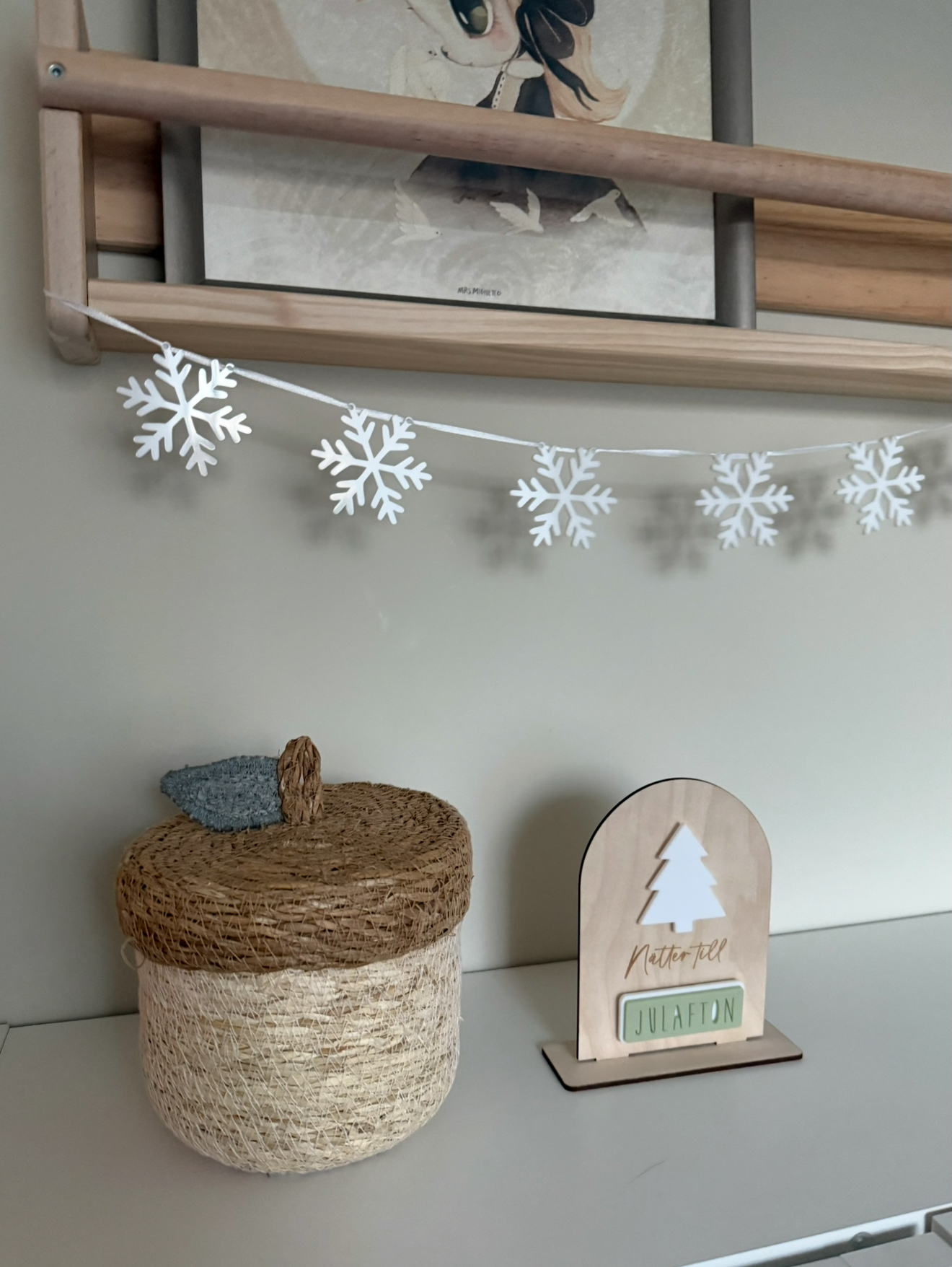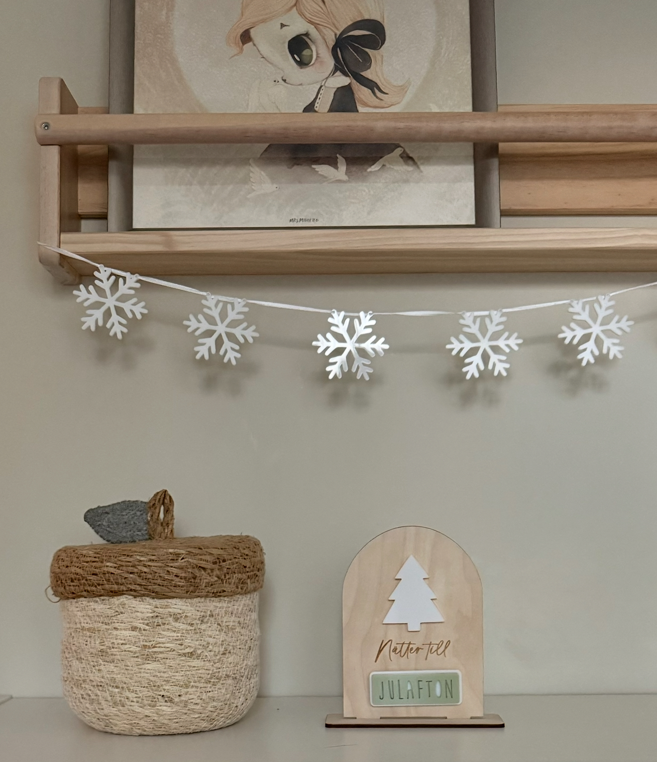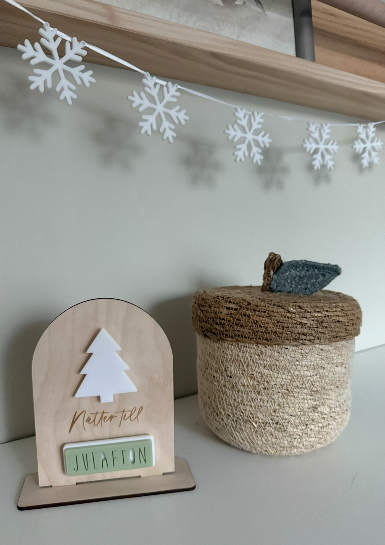 Naturellt trä, Vit akryl, Glitterakryl Guld, Glitterakryl Silver