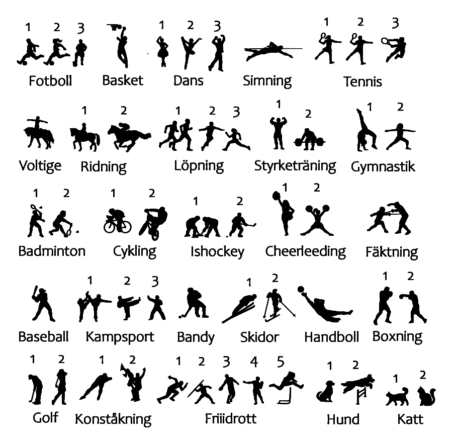 | Figur | Fotboll 1, Fotboll 2, Fotboll 3, Basket, Dans 1, Dans 2, Dans 3, Simning, Tennis 1, Tennis 2, Tennis 3, Voltige, Ridning 1, Ridning 2, Löpning 1, Löpning 2, Löpning 3, Styrketräning 1, Styrketräning 2, Gymnastik 1, Gymnastik 2, Badminton 1, Badminton 2, Cykling 1, Cykling 2, Ishockey 1, Ishockey 2, Cheerleeding 1, Cheerleeding 2, Fäktning, Baseball, Kampsport 1, Kampsport 2, Kampsport 3, Bandy, Skidor 1, Skidor 2, Handboll, Boxning 1, Boxning 2, Golf 1, Golf 2, Konståkning 1, Konståkning 2, Friidrott 1, Friidrott 2, Friidrott 3, Friidrott 4, Friidrott 5, Hund 1, Hund 2, Katt 1, Katt 2 |