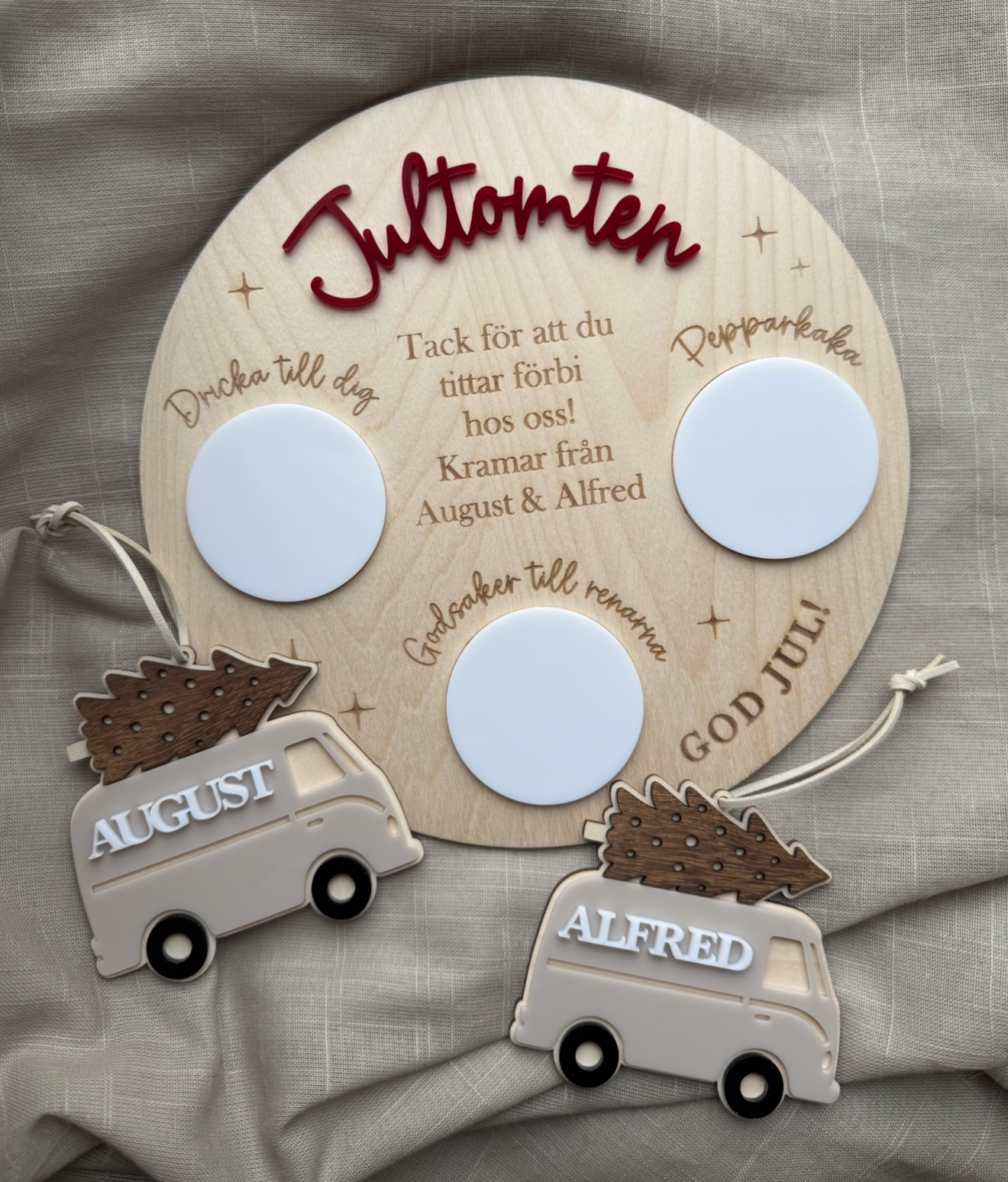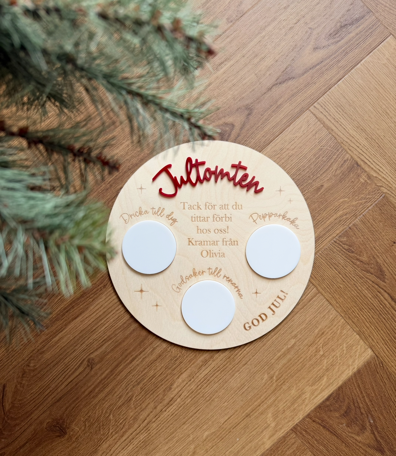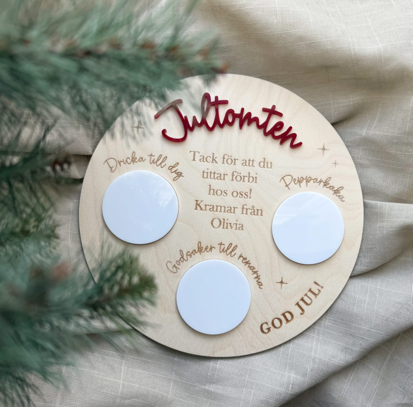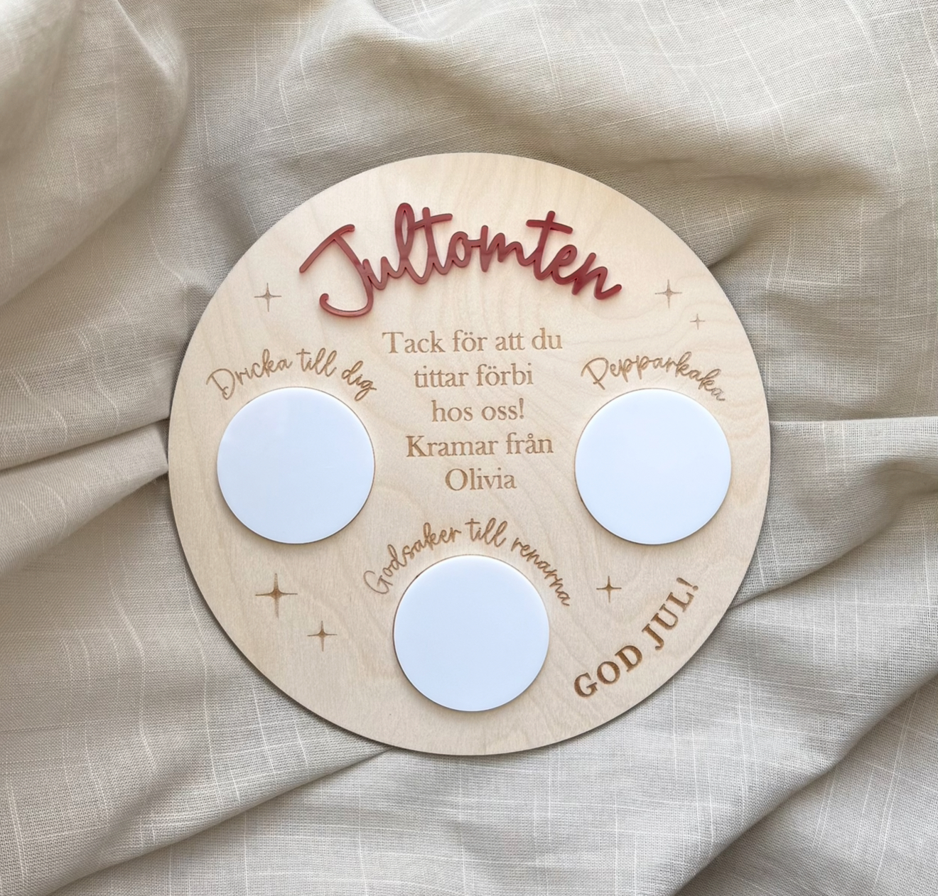 Skapas i naturellt trä med gravyr och detaljer i akryl. Valfri färg på rubriken ”Jultomten” (de tre cirklarna skapas i vit akryl)