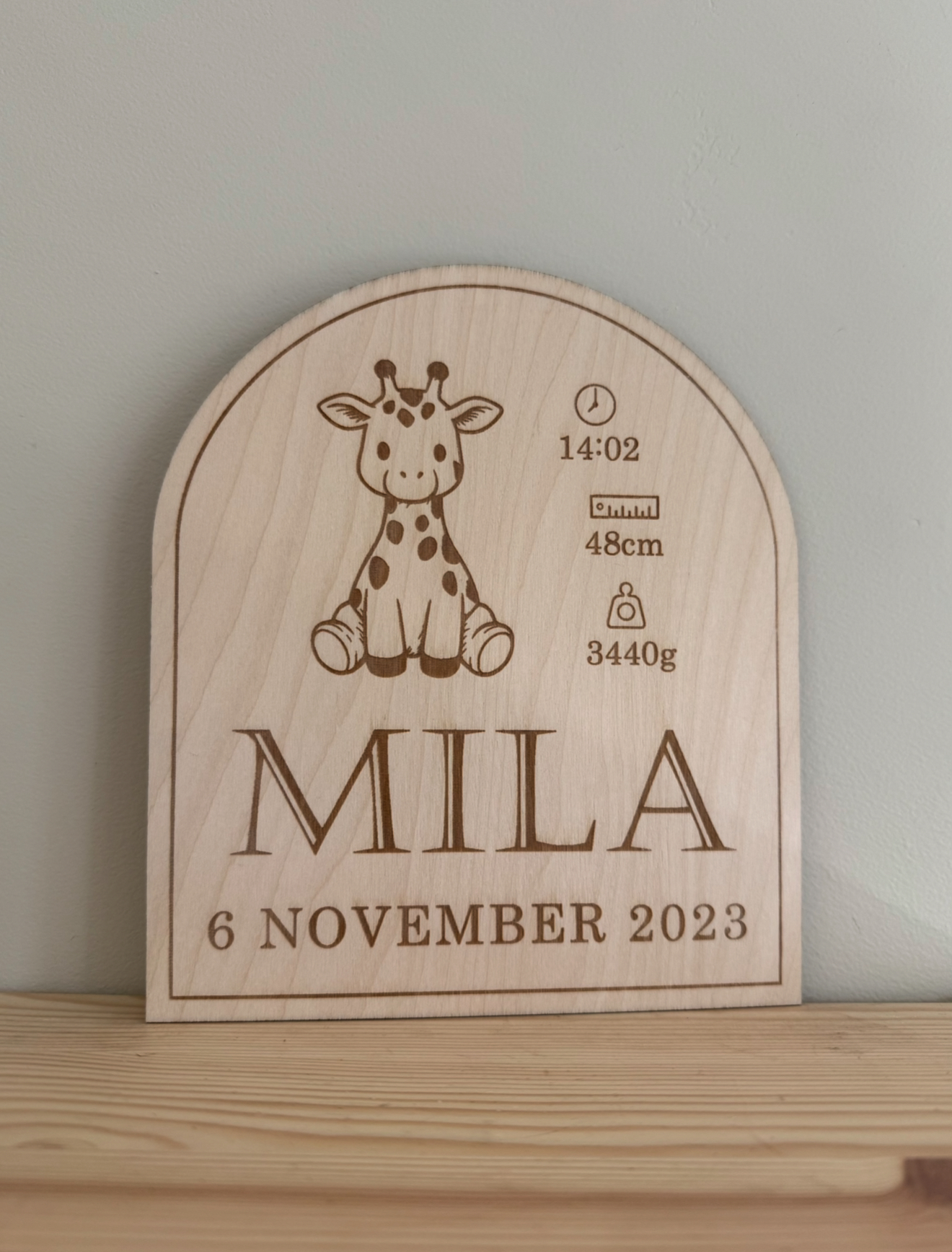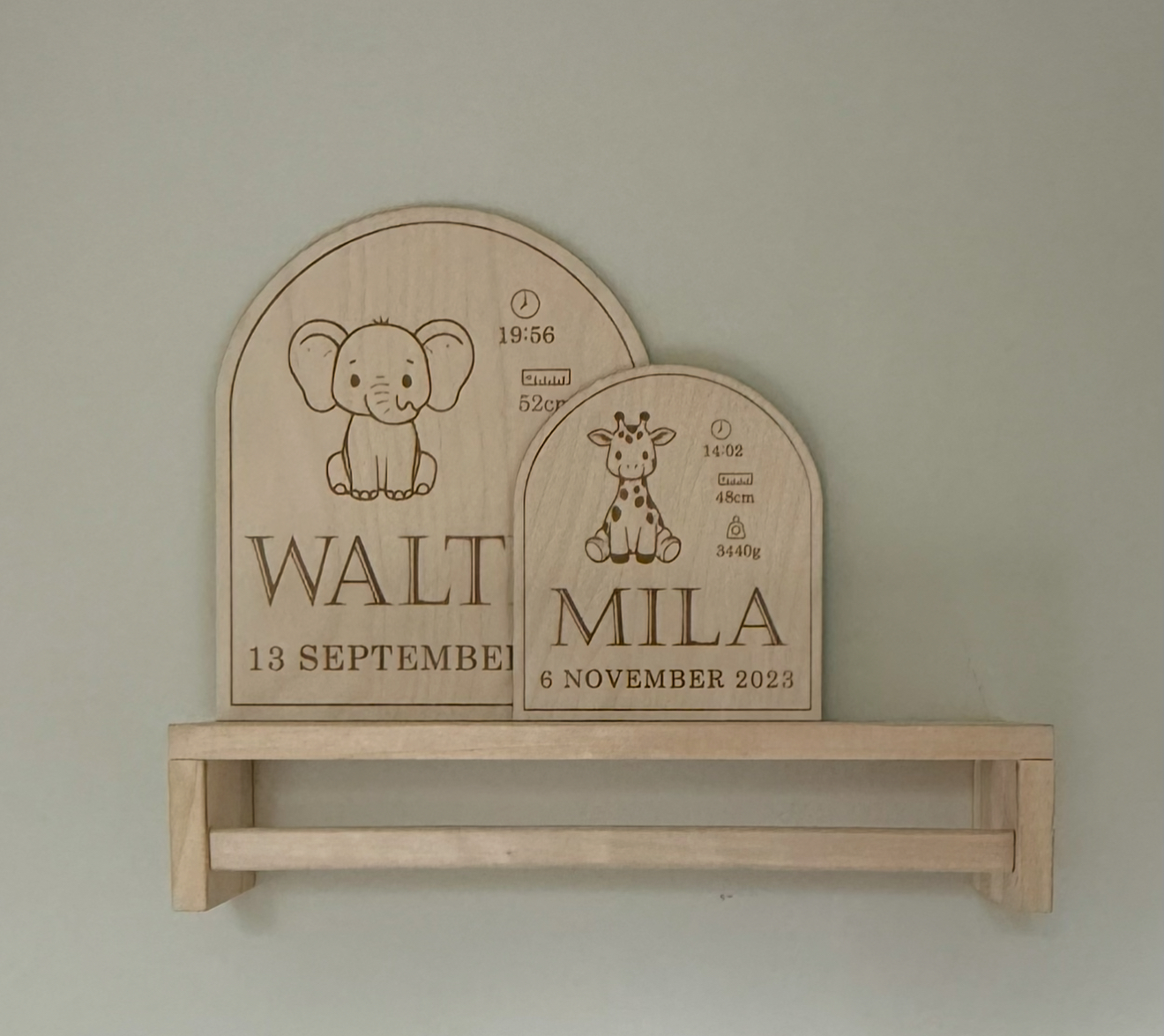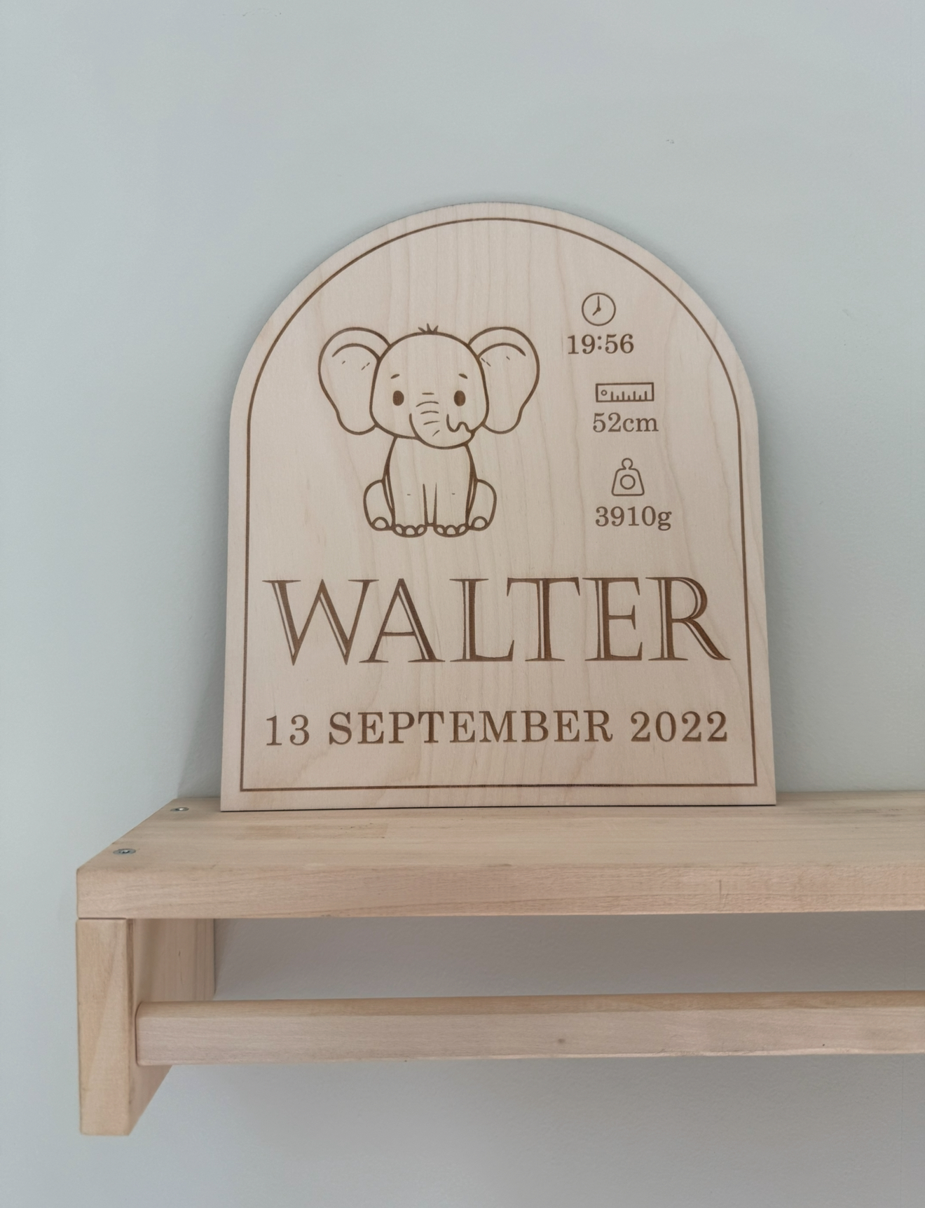 En vacker tidlös inredningsdetalj med barnets födelseuppgifter – namn, datum, klockslag, längd och vikt tillsammans med valfritt djur som du själv väljer