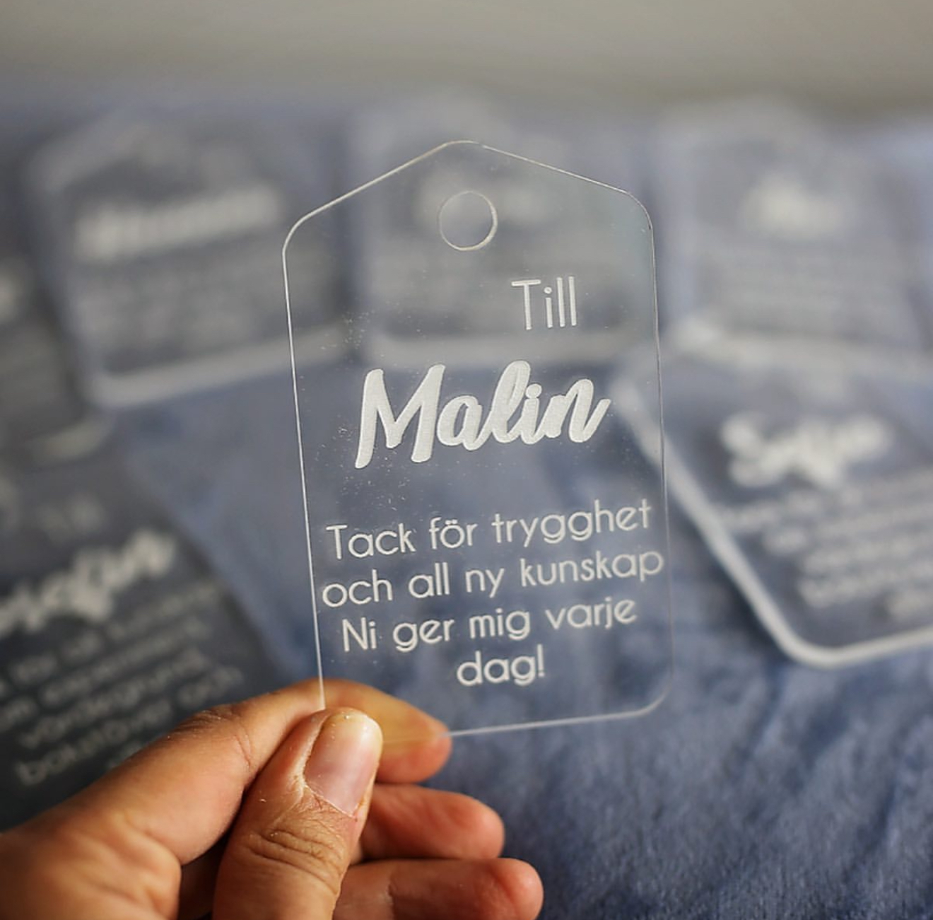 Ett hål skapas upptill på taggen för att kunna fästas lätt i ett snöre.
