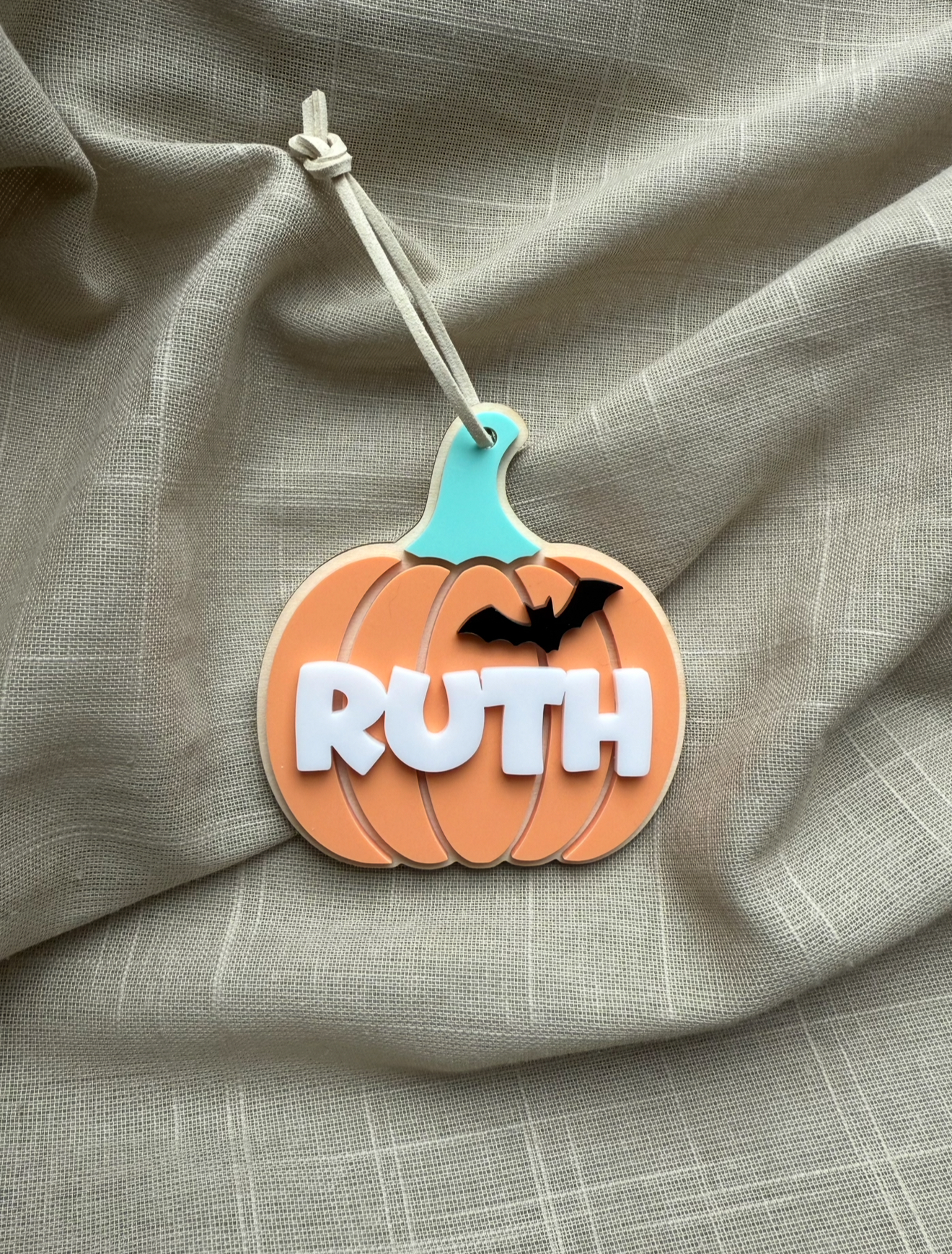 Skapas med botten i naturell trä och pumpa och namn i akryl