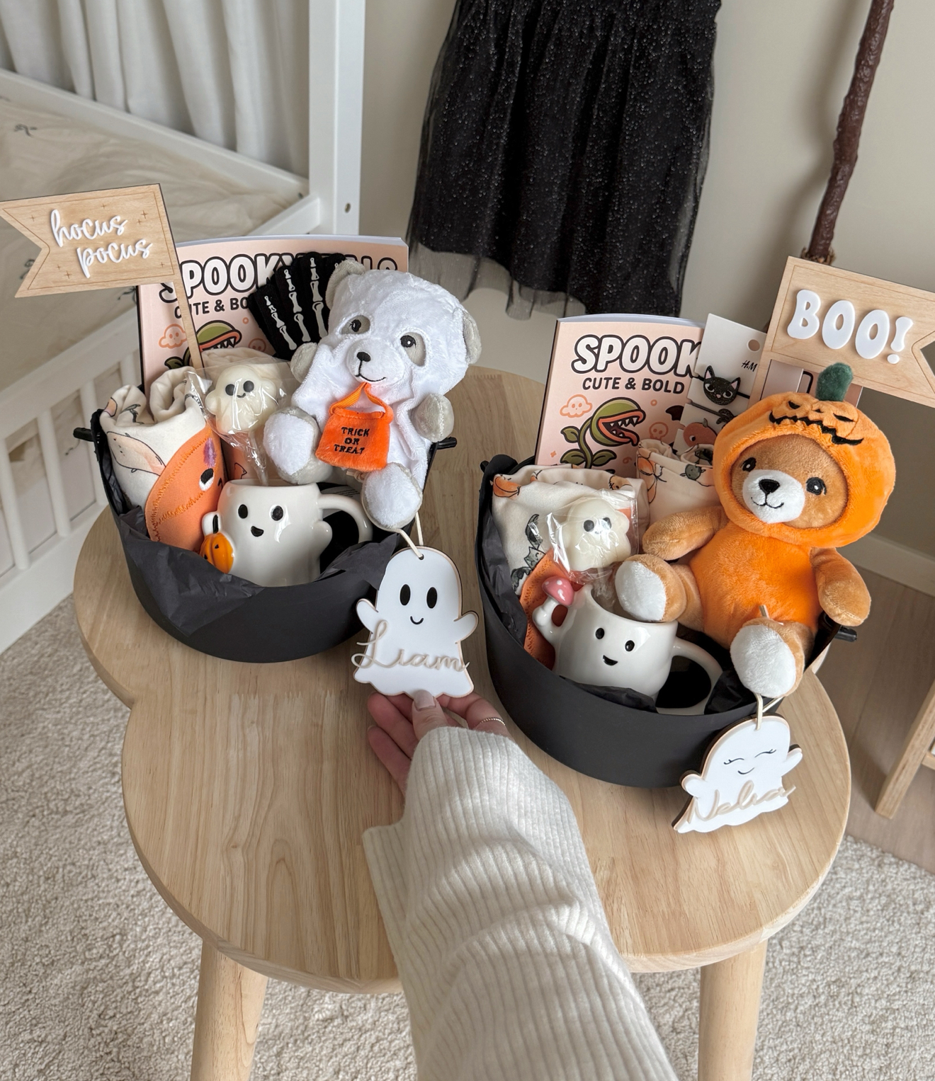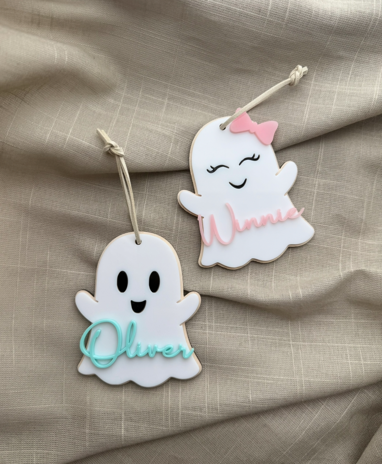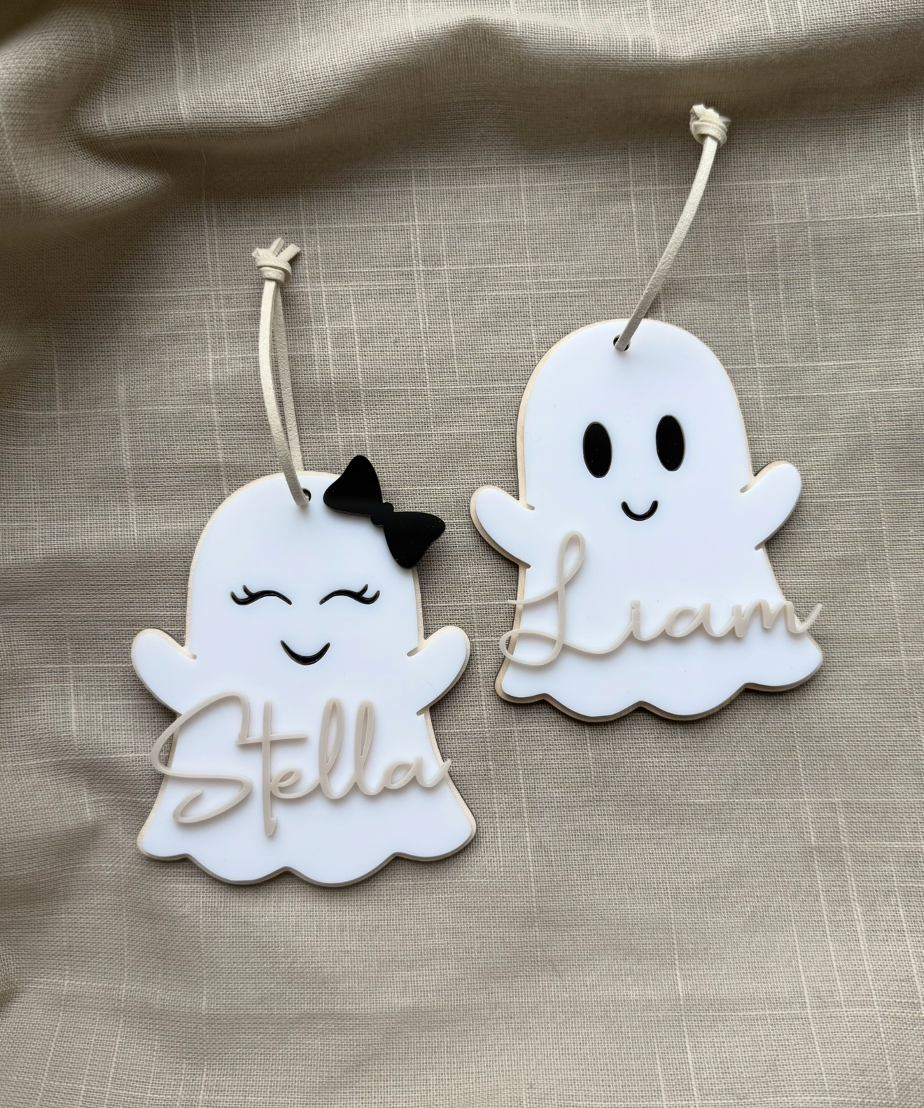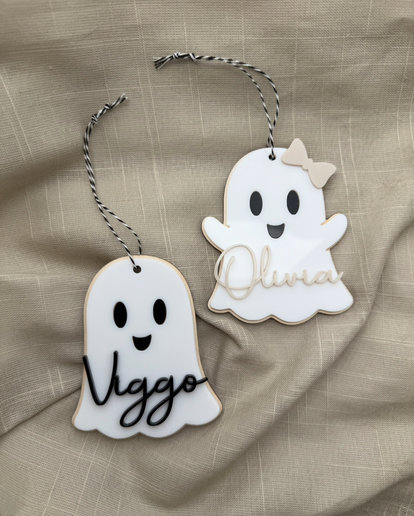 Skapas med botten i naturell trä, spöke i vit akryl och namn i akryl/trä