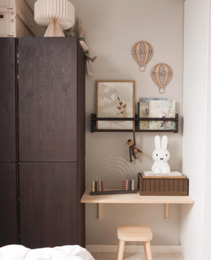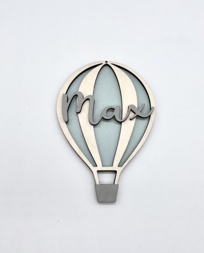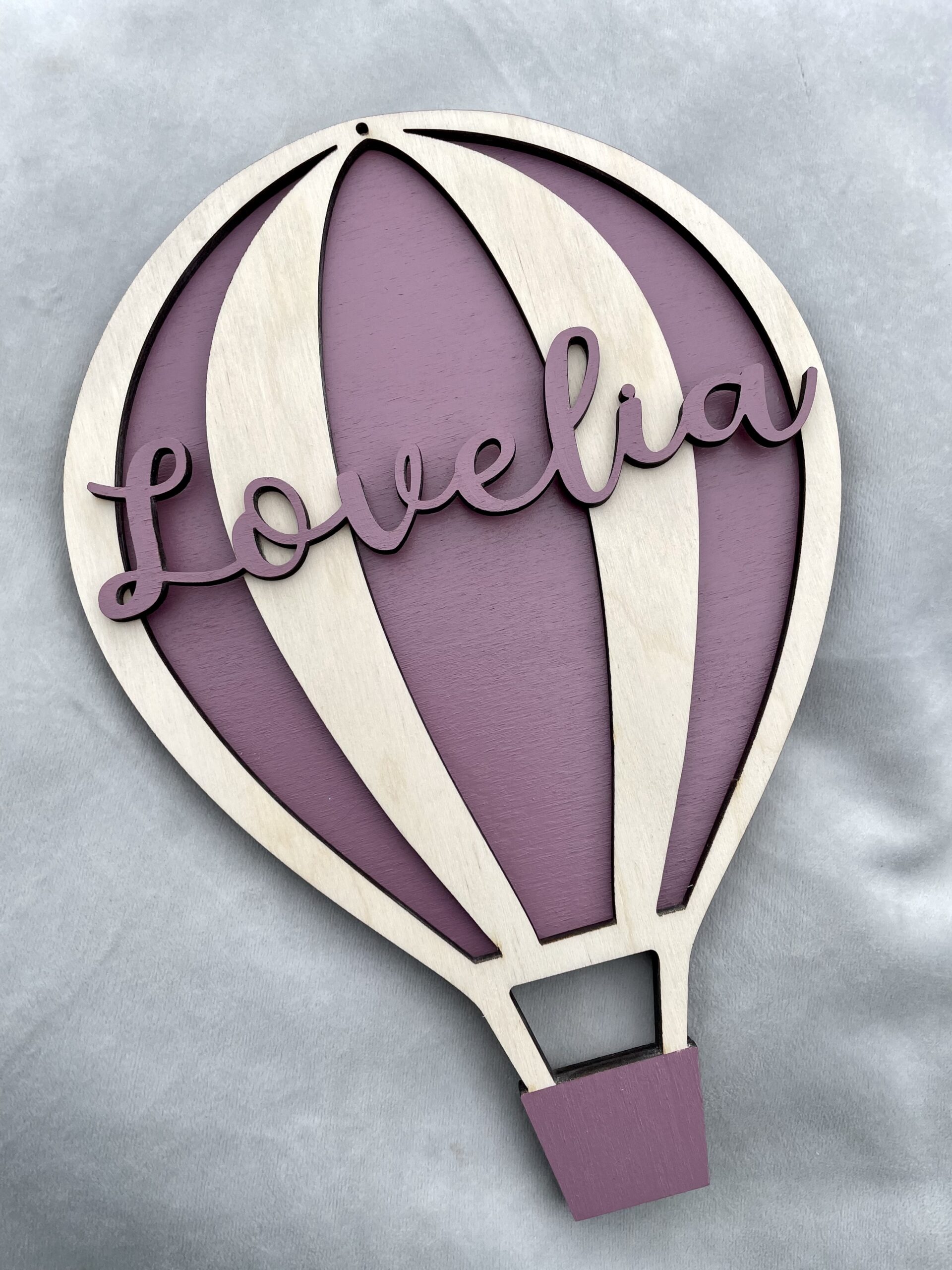 Skapas i ljust naturellt trä eller bambu. Bakgrund på luftballong målas i valfri färg samt namn+korg på luftballongen målas i annan valfri färg.