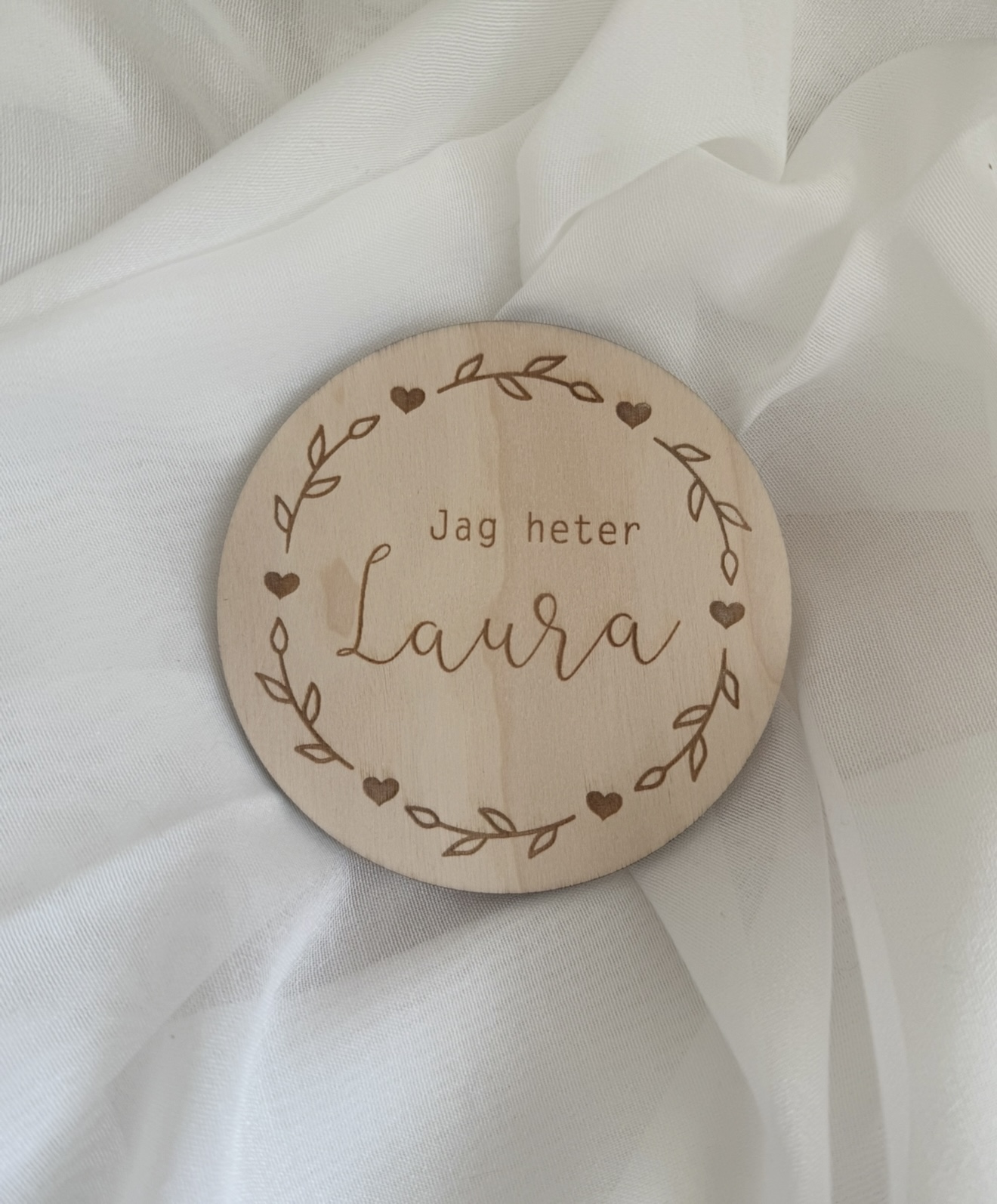 Söt rund skylt graverad med en liten kvist eller kvistar & hjärtan med valfri text.