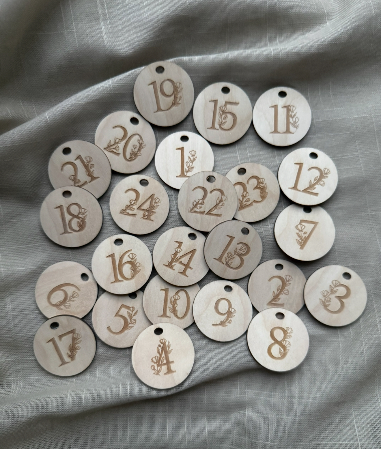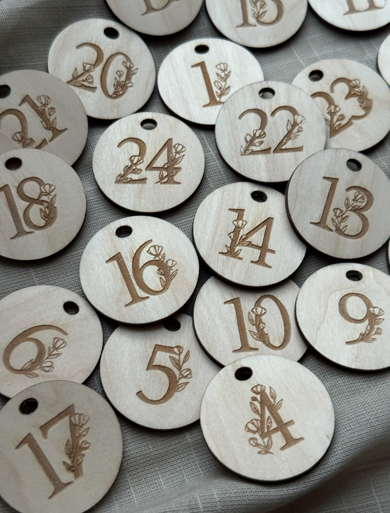 De runda brickorna är tillverkade i trä med fint ingraverade siffror med en liten blomdetalj