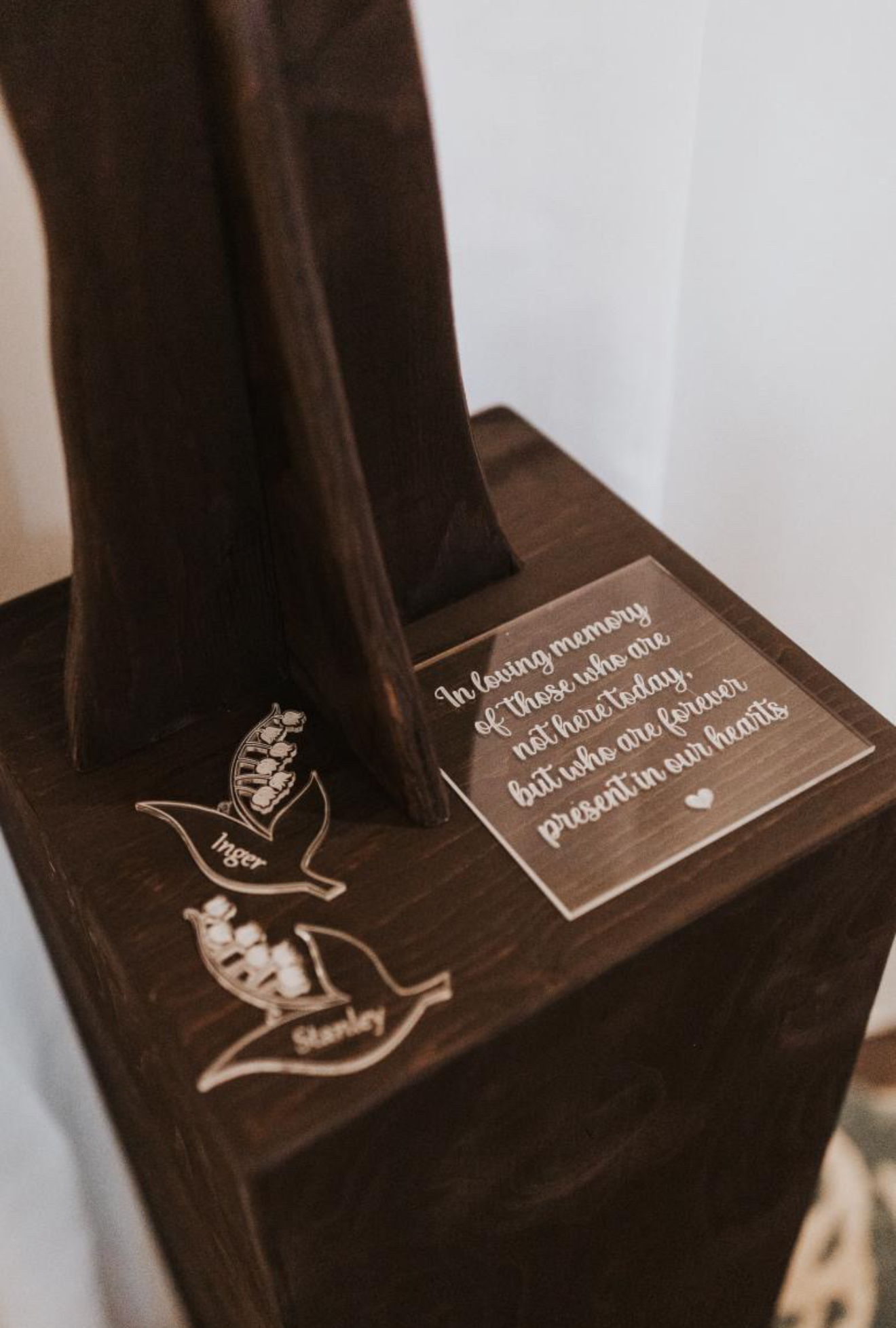 Färg skylt | Naturellt trä (brun text i gravyr), Genomskinlig plexi (vit text i gravyr) |