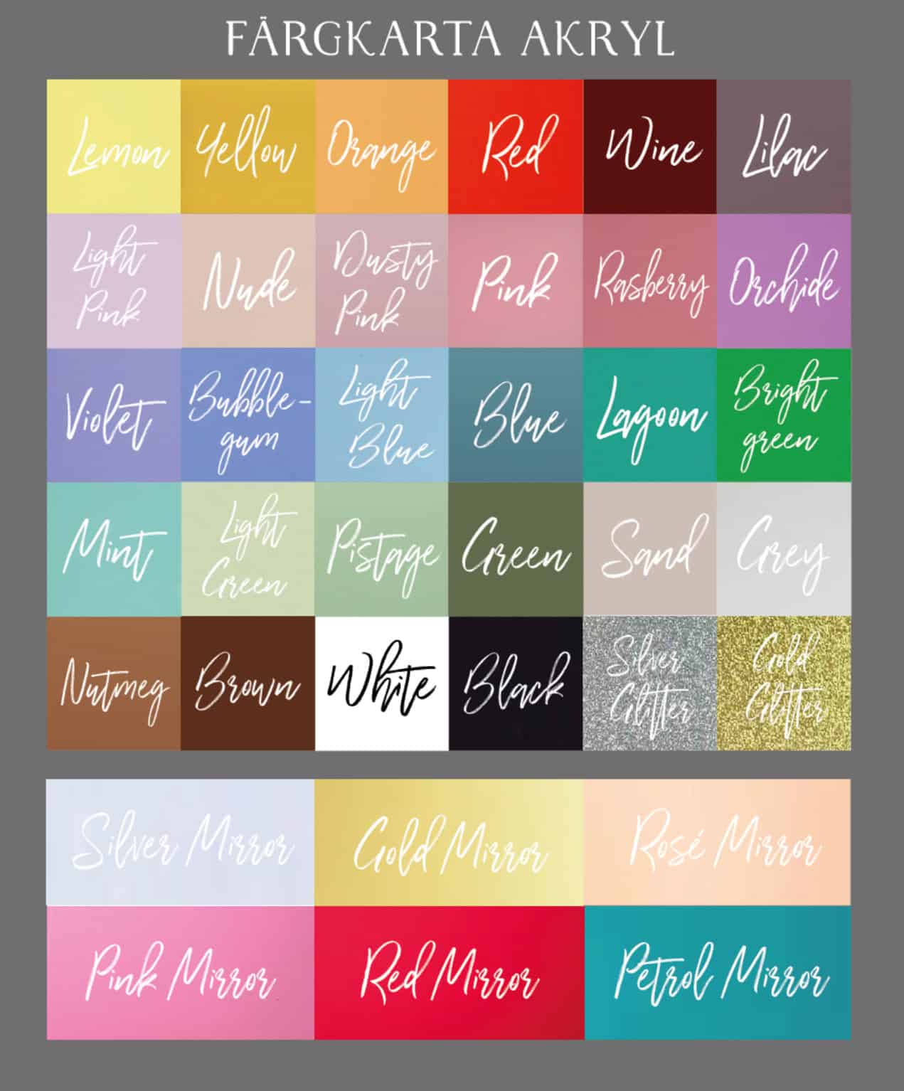 | Färg (namn-hjärta-namn) | Gravyr (direkt på trä/plexi), Lemon, Orange, Rasberry, Pink, Violet, Bubblegum, Blue, Mint, Grey, Yellow, Red, Light pink, Sand, Lake, Green, Brown (transparent), White, Black, Silver Mirror, Guld Mirror, Rosé Mirror, Pink Mirror, Red Mirror, Petrol Mirror, Naturellt trä |